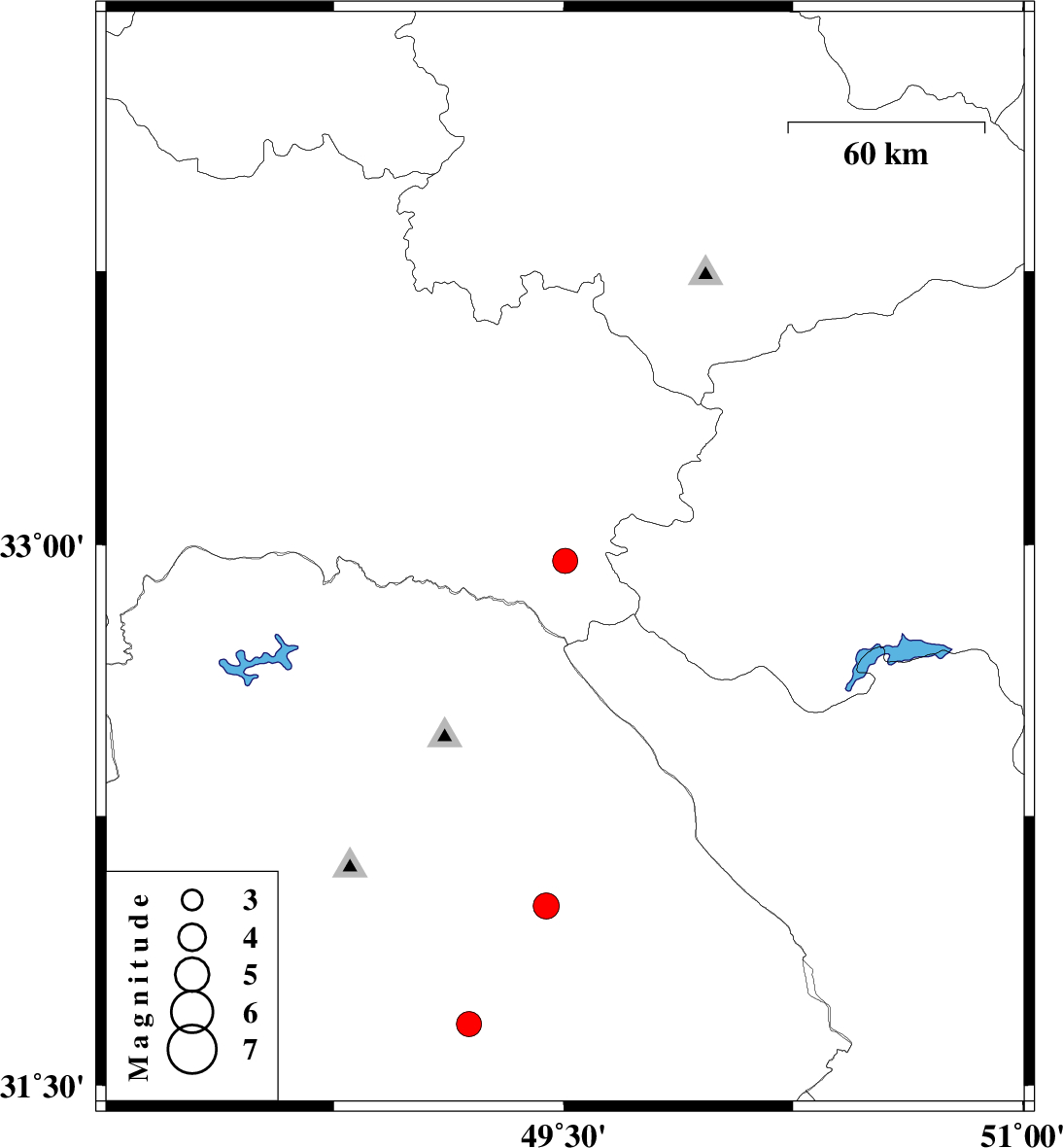 | 2026/01/17 | 16:27:52.9 | 19:57:52.9 | 32.956 | 49.505 | 12 | ML3.7 | Lorestan Province, 56 km South of Azna | ||