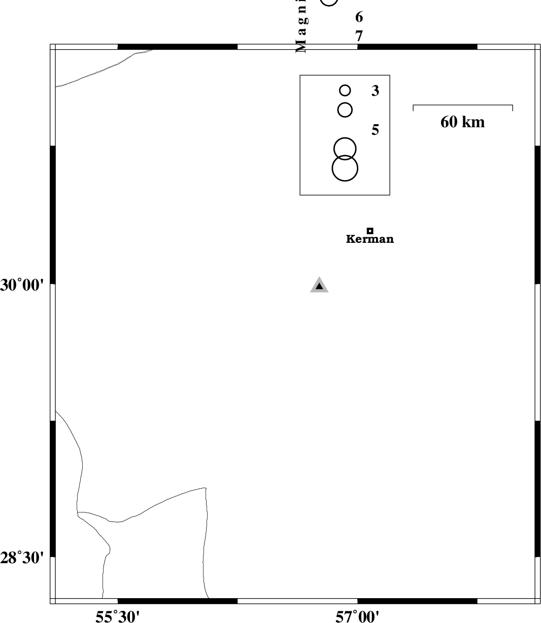 | 2010/08/11 | 14:09:47.5 | 18:39:47.5 | 29.63 | 57 | 5 | ML3.4 | Kerman Province, 53 km South-East of Bardsir | ||