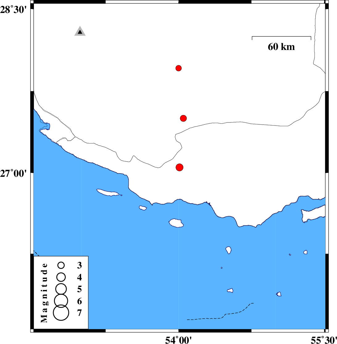 | 2010/09/25 | 01:06:05.1 | 04:36:05.1 | 27.05 | 54.01 | 14 | ML3.4 | Hormozgan Province, 38 km South-West of Bastak | ||