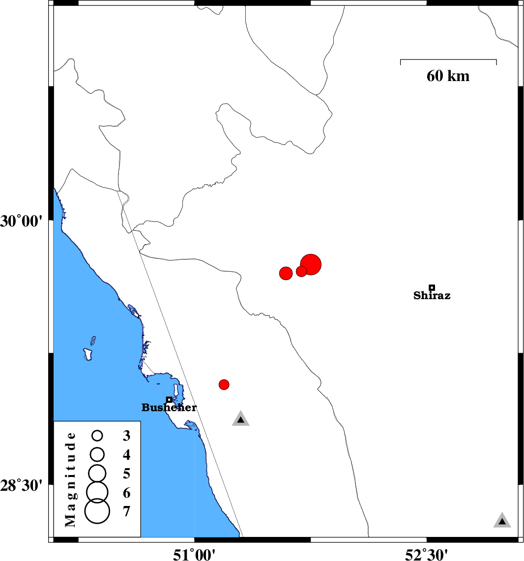 | 2010/09/20 | 08:21:50.4 | 12:51:50.4 | 29.07 | 51.19 | 17 | ML2.9 | Bushehr Province, 21 km South of Borazjan |