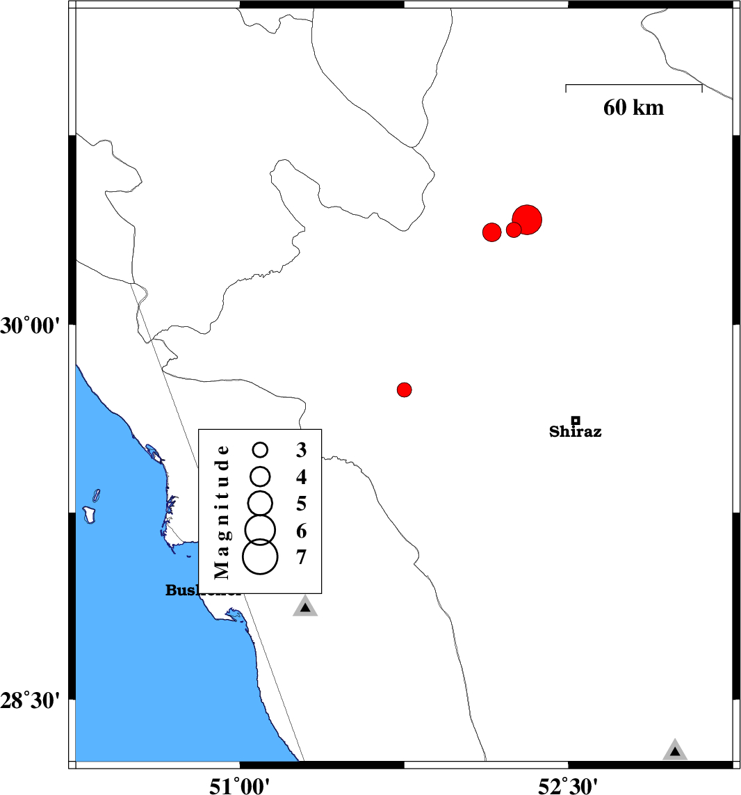 | 2010/09/20 | 08:21:50.4 | 12:51:50.4 | 29.07 | 51.19 | 17 | ML2.9 | Bushehr Province, 21 km South of Borazjan |