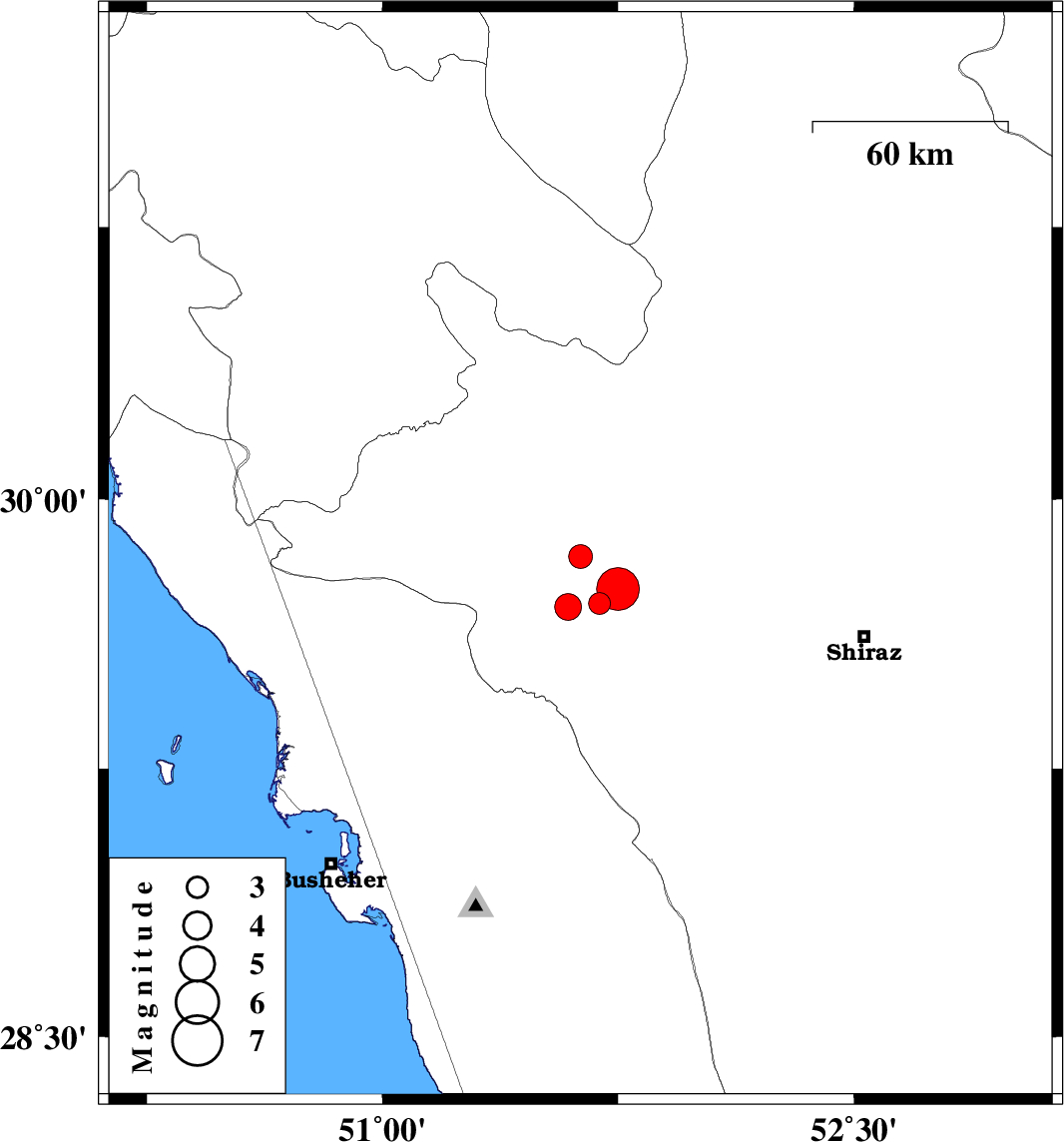 | 2010/09/27 | 11:22:44.6 | 14:52:44.6 | 29.75 | 51.75 | 15 | ML6 | Fars Province, 17 km North of Kazerun |