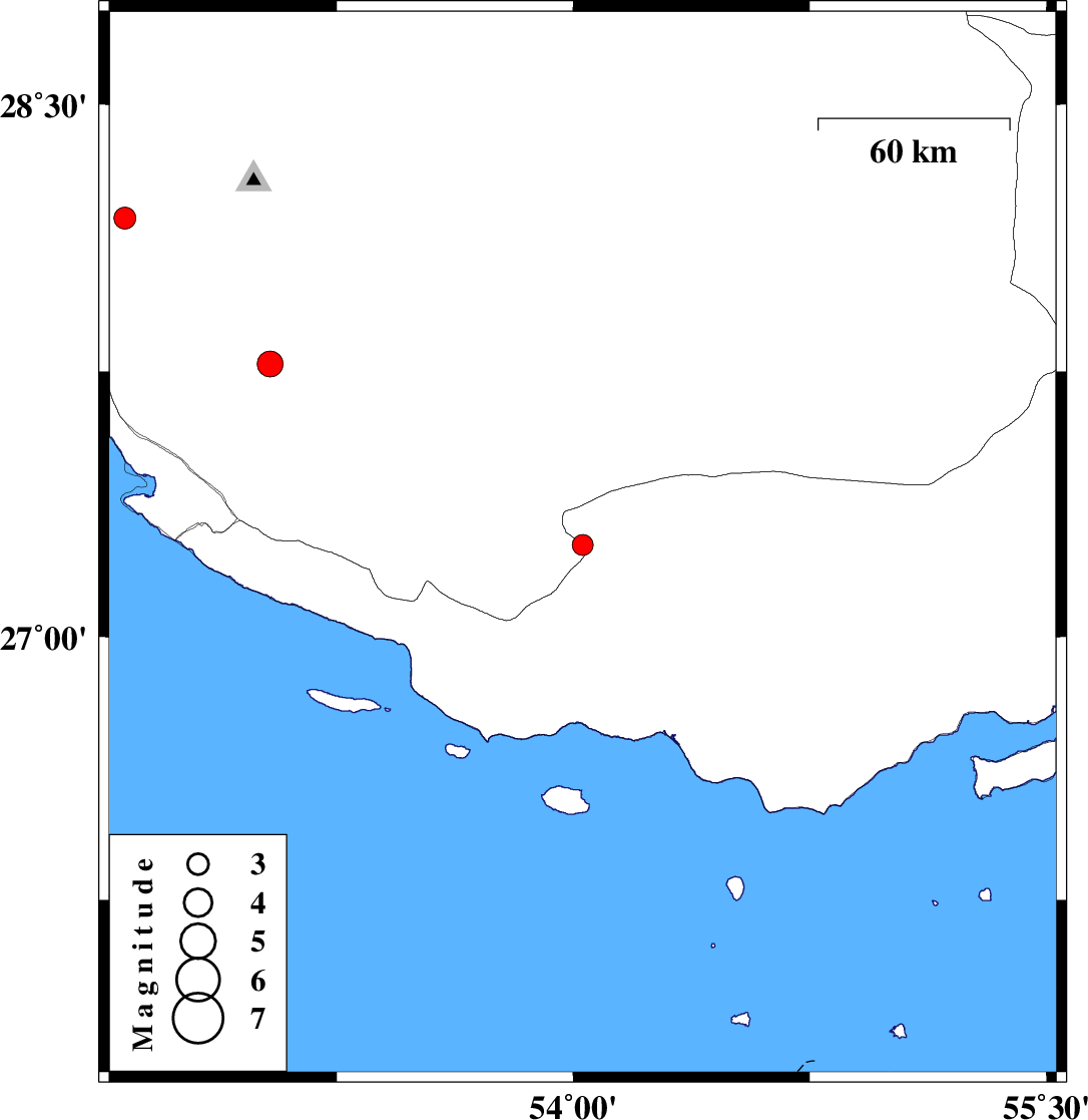 | 2010/10/06 | 19:27:44.1 | 22:57:44.1 | 27.26 | 54.03 | 26 | ML2.9 | Hormozgan Province, 34 km West of Bastak | ||
