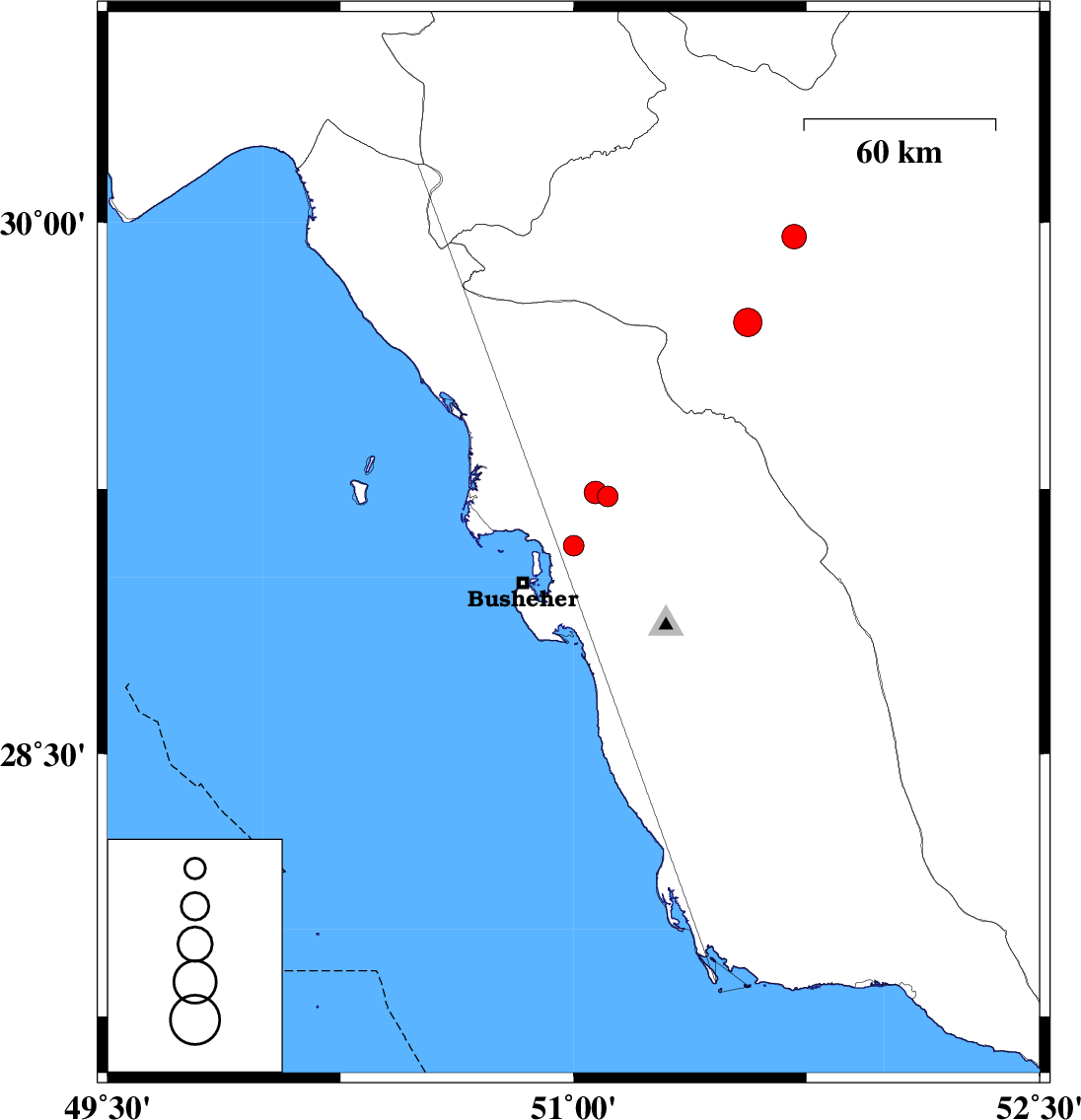 2010/10/08 22:28:57.1 01:58:57.1 29.095130 ML2.9 Bushehr Province, 20 km North-East of Busheher