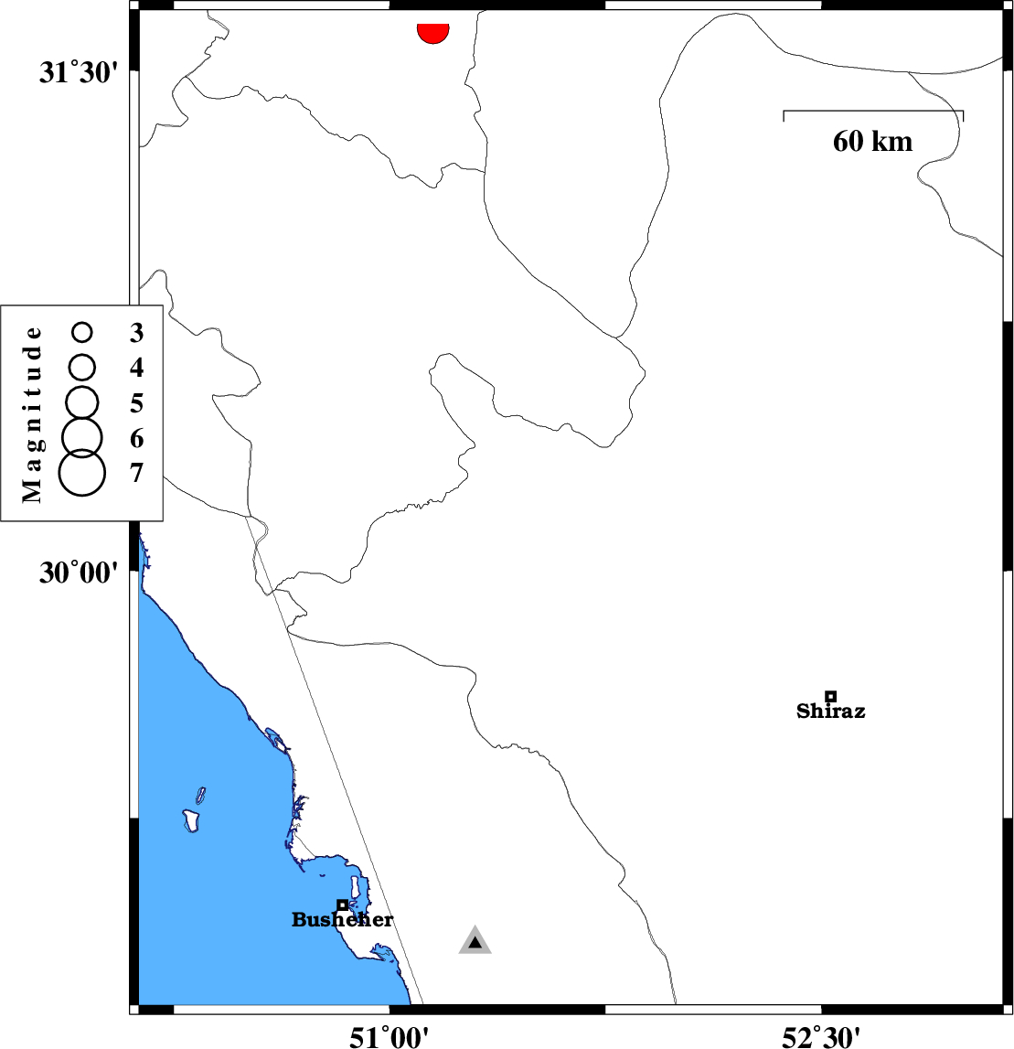 | 2010/12/01 | 19:55:45.7 | 23:25:45.7 | 30.18 | 51.63 | 46 | ML4.9 | Fars Province, 13 km East of Nurabad | ||