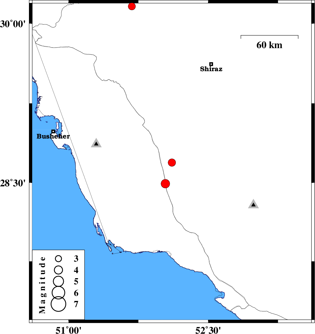 | 2010/12/07 | 11:51:58.6 | 15:21:58.6 | 30.16 | 51.68 | 43 | ML3.5 | Fars Province, 16 km East of Nurabad |