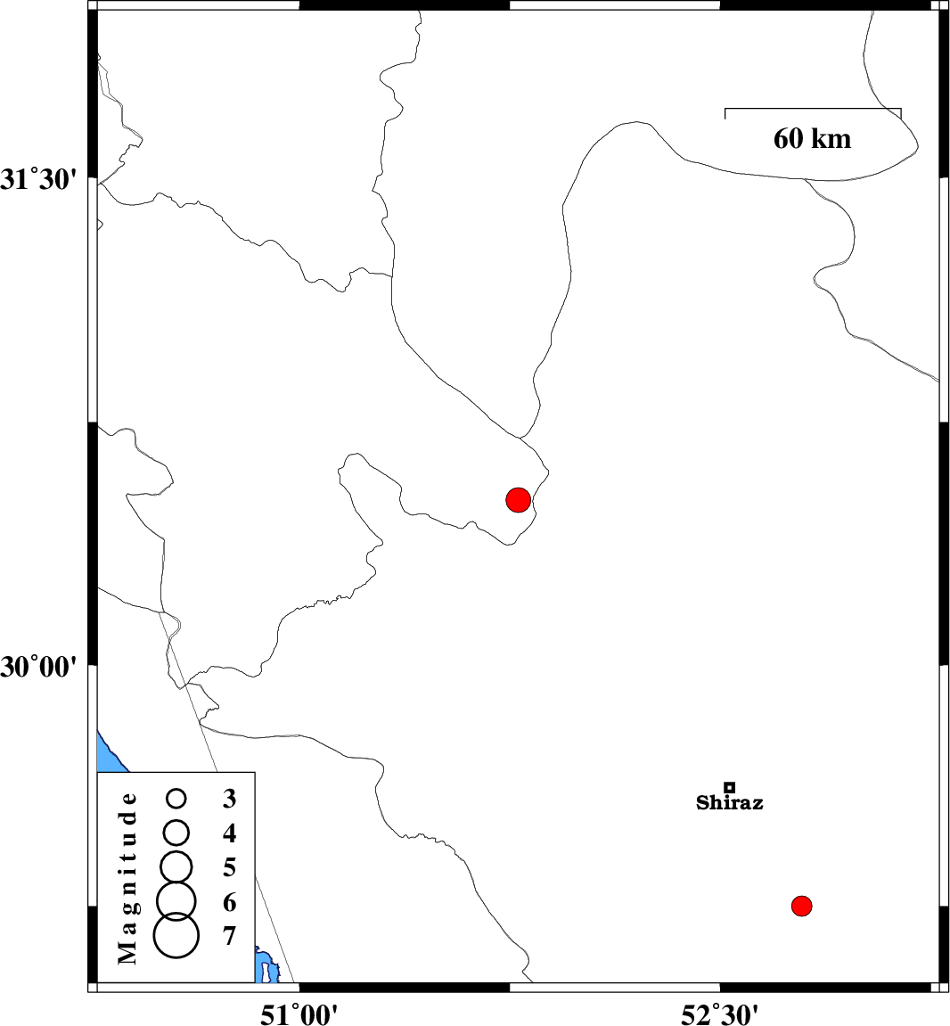 | 2011/01/02 | 07:46:05.1 | 11:16:05.1 | 30.51 | 51.78 | 33 | ML4 | Kohkiluieh va boyerahmad Province, 27 km South-East of Yasuj | ||