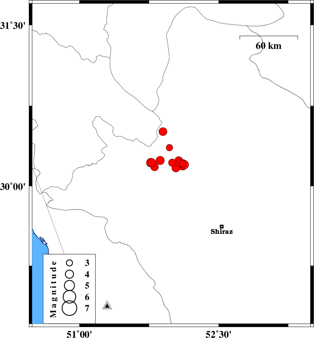2011/01/05 22:27:34.6 01:57:34.6 30.2251.6646 ML3.9 Fars Province, 18 km North-East of Nurabad