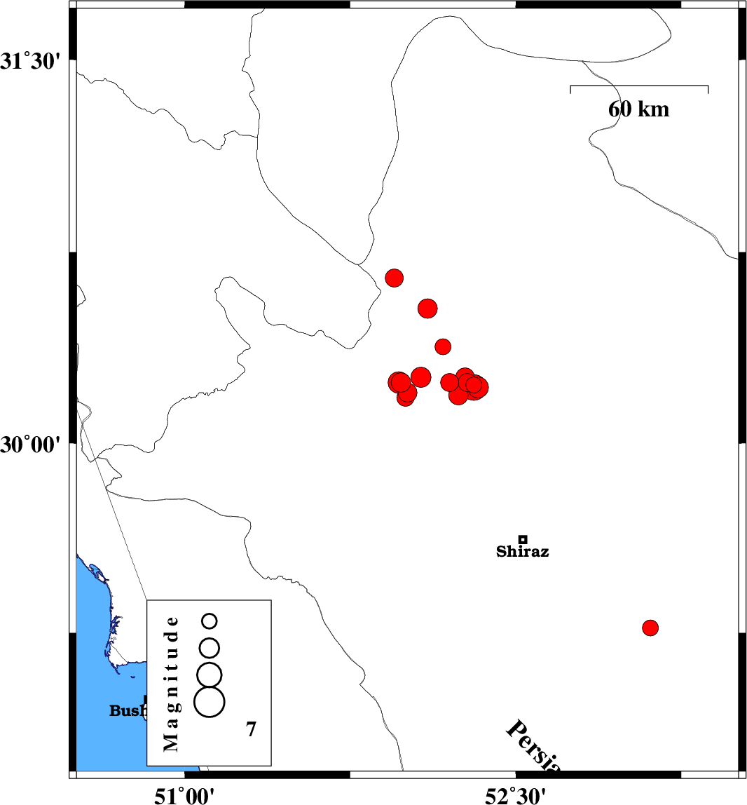 2011/01/05 22:27:34.6 01:57:34.6 30.2251.6646 ML3.9 Fars Province, 18 km North-East of Nurabad