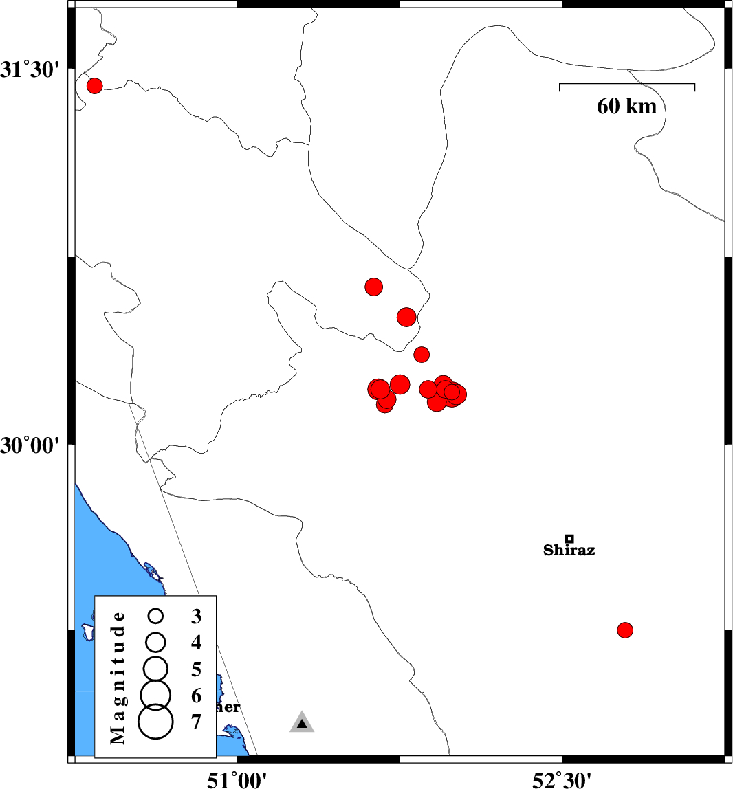 2011/01/05 22:27:34.6 01:57:34.6 30.2251.6646 ML3.9 Fars Province, 18 km North-East of Nurabad