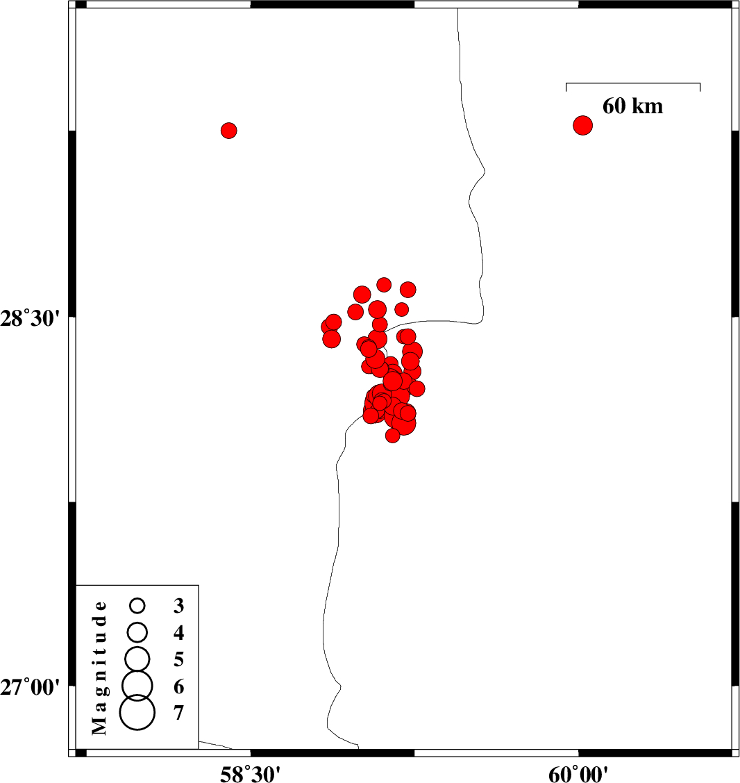 2011/01/27 08:38:28.5 12:08:28.5 28.1559.0915 Mb6.2 Kerman Province, 139 km North-East of Kahnuj