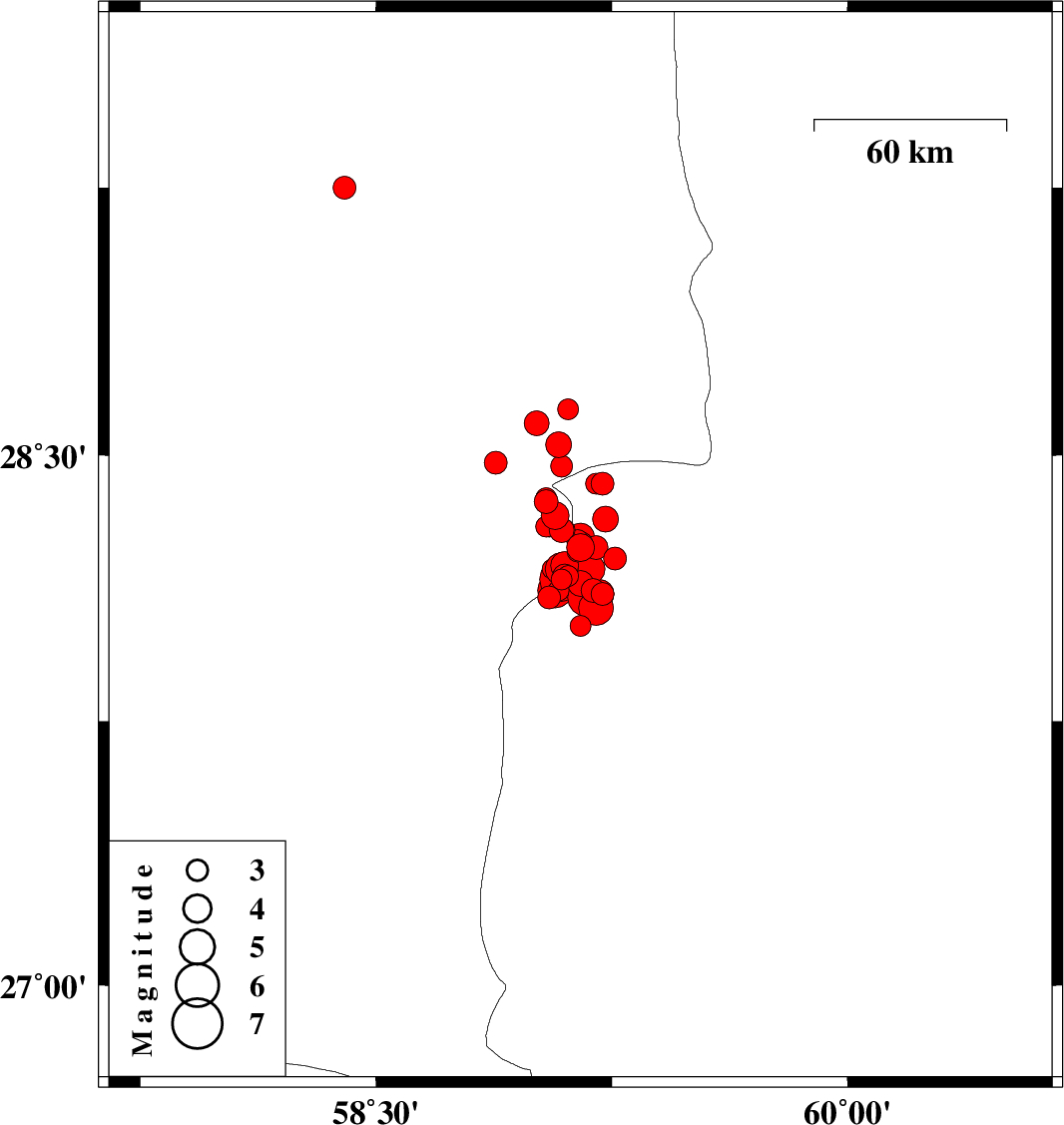 2011/01/27 08:38:28.5 12:08:28.5 28.1559.0915 Mb6.2 Kerman Province, 139 km North-East of Kahnuj