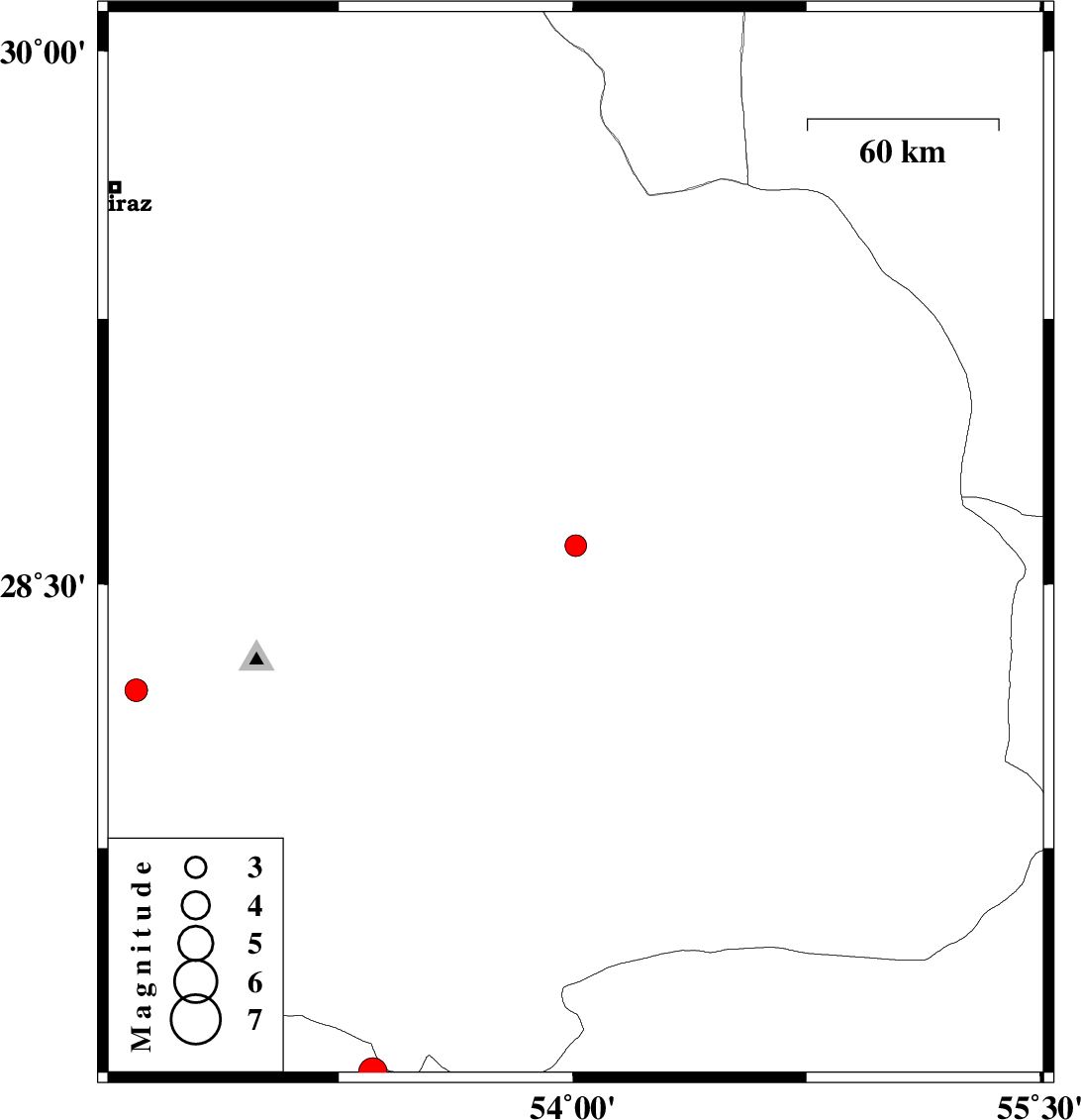 | 2011/02/06 | 18:51:08.4 | 22:21:08.4 | 28.61 | 54.01 | 14 | ML3.1 | Fars Province, 58 km South of Estahban | ||