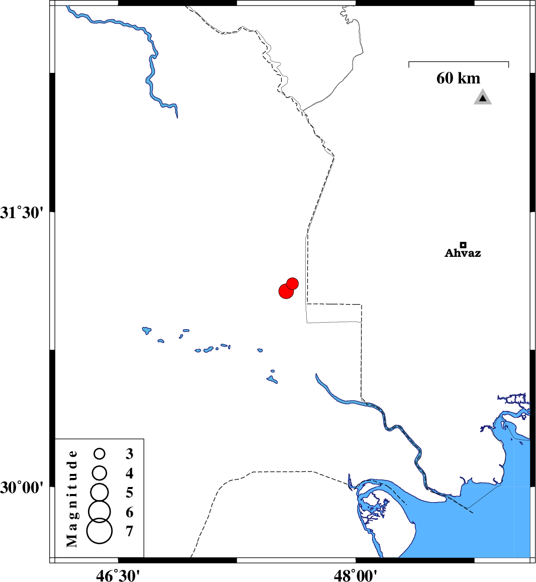 | 2011/02/07 | 02:38:27.4 | 06:08:27.4 | 31.07 | 47.56 | 23 | ML4.2 | Iraq, 65 km North-West of Al Basrah |
