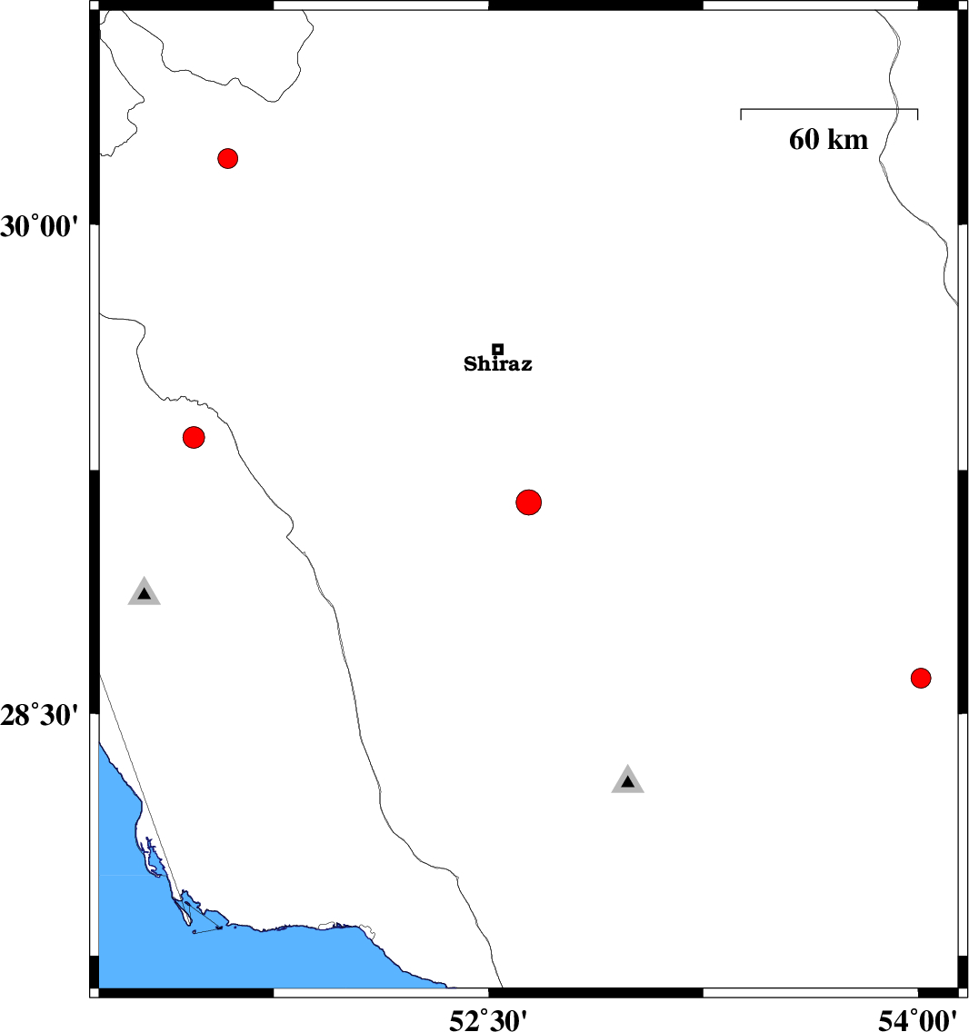 | 2011/02/13 | 11:56:13.8 | 15:26:13.8 | 29.15 | 52.64 | 10 | ML4 | Fars Province, 36 km North of Firuz Abad | ||