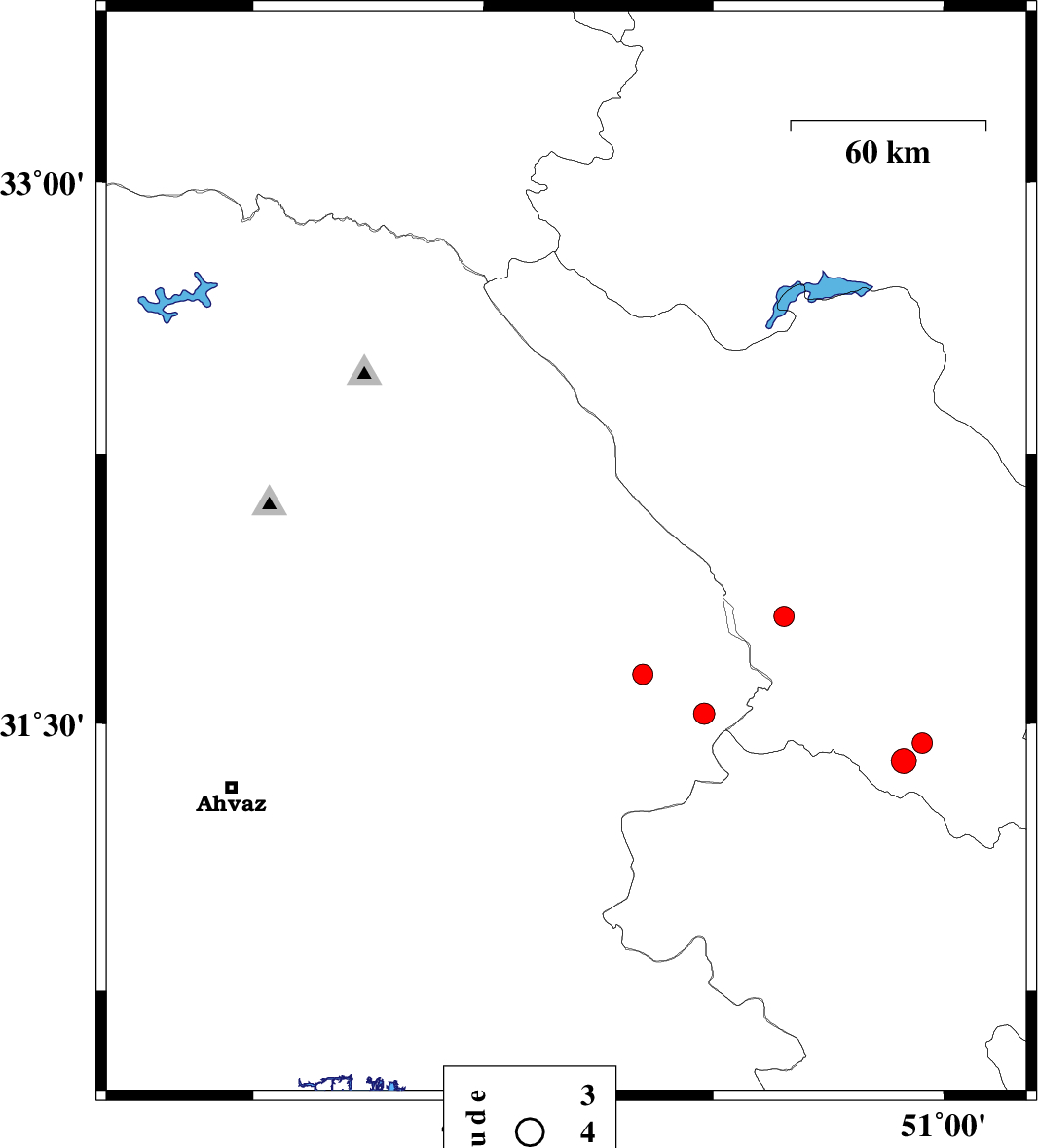 | 2011/02/24 | 06:16:51.2 | 09:46:51.2 | 32.21 | 48.92 | 26 | ML3 | Khoozestan Province, 19 km North of Shushtar | ||