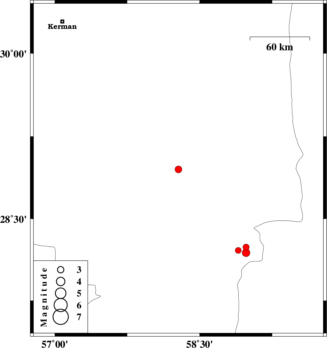 | 2011/03/02 | 00:40:08.7 | 04:10:08.7 | 28.95 | 58.28 | 14 | ML3.3 | Kerman Province, 19 km South of Bam | ||
