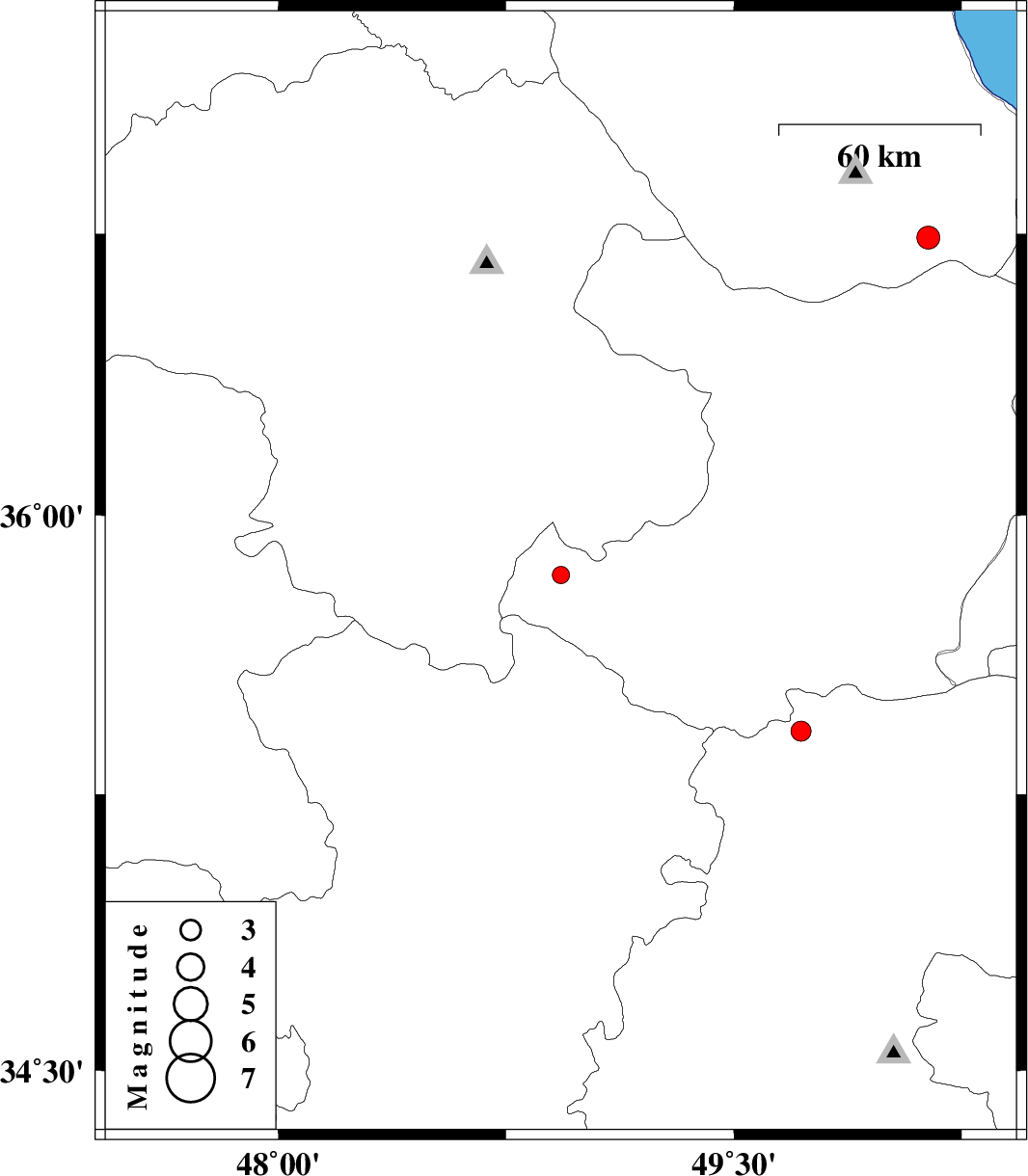 | 2011/03/12 | 13:06:34.7 | 16:36:34.7 | 35.42 | 49.72 | 44 | ML2.9 | Markazi Province, 72 km South of Takestan |