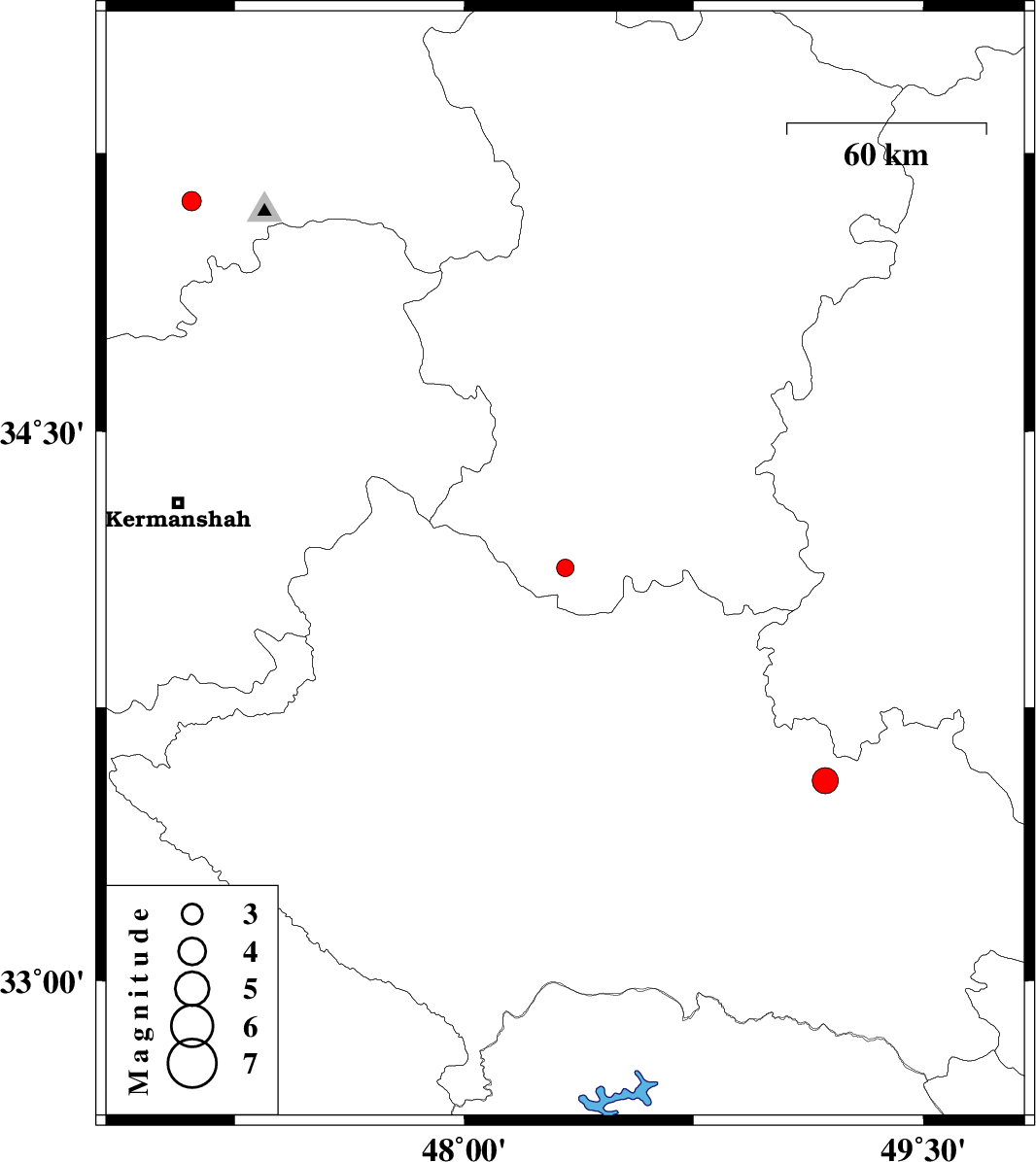 | 2011/03/22 | 07:07:57.4 | 11:37:57.4 | 33.55 | 49.18 | 16 | ML3.8 | Lorestan Province, 13 km East of Dorud |