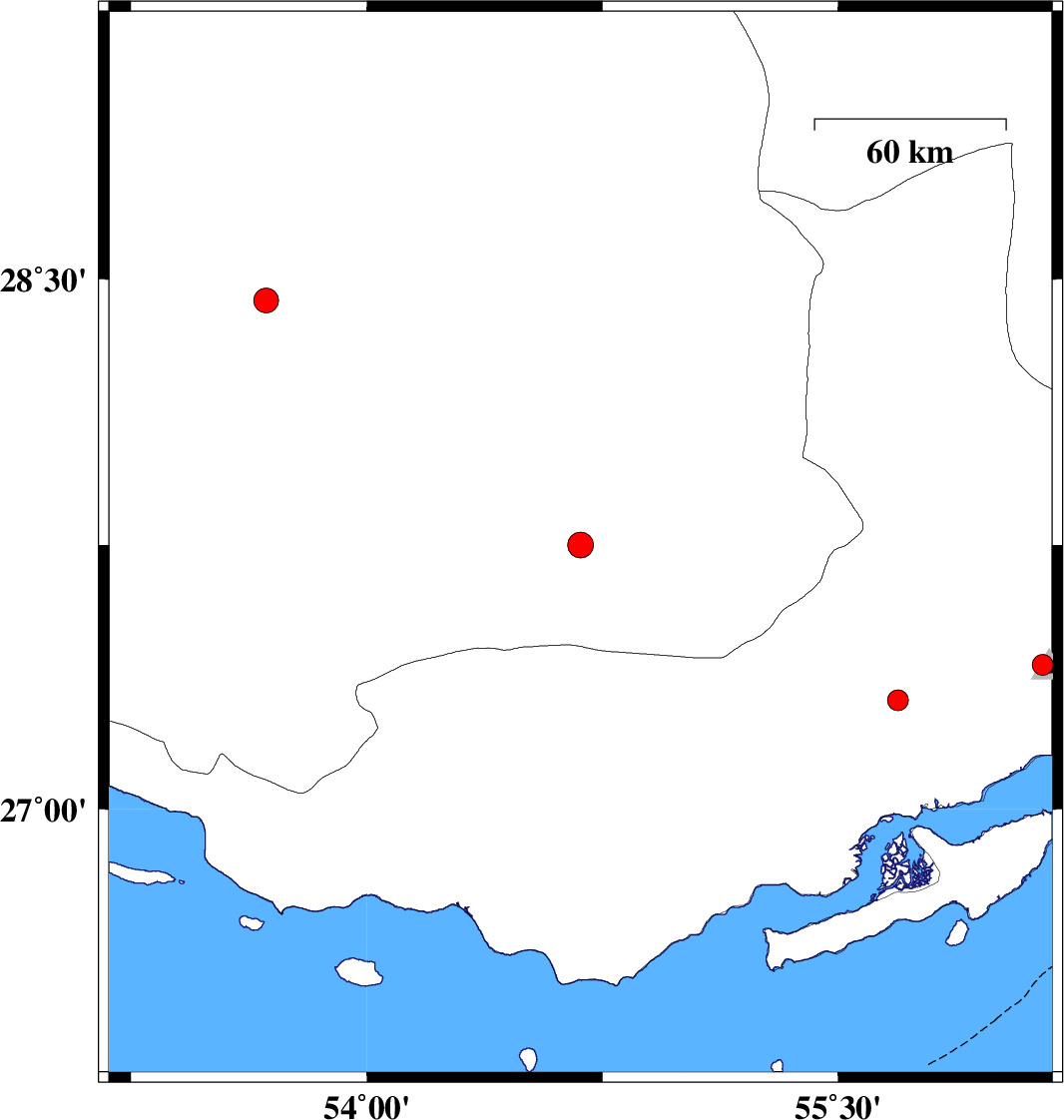 | 2011/04/01 | 02:03:17.5 | 06:33:17.5 | 27.31 | 55.69 | 14 | ML3 | Hormozgan Province, 61 km North-West of Bandar-e abbas | ||