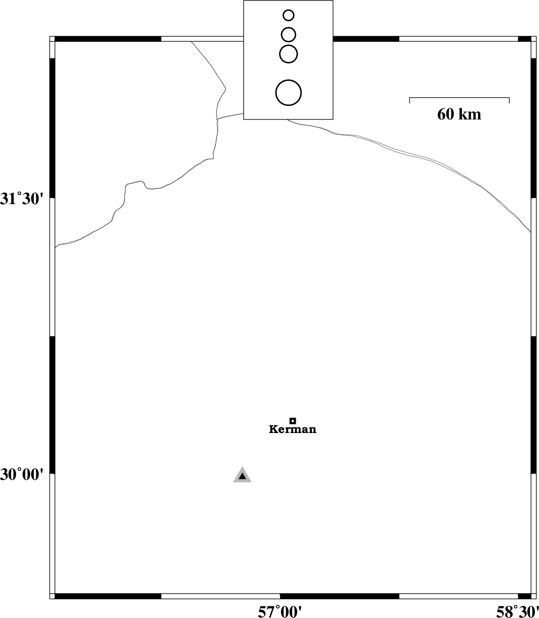 | 2011/04/30 | 08:55:13.2 | 13:25:13.2 | 30.84 | 57.08 | 14 | ML3.7 | Kerman Province, 49 km East of Zarand |