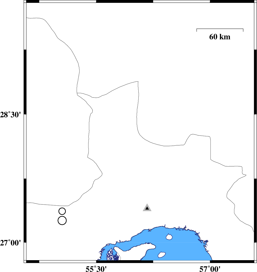 | 2011/04/26 | 20:11:02.6 | 00:41:02.6 | 27.68 | 57.47 | 35 | ML2.8 | Kerman Province, 30 km North of Manujan |