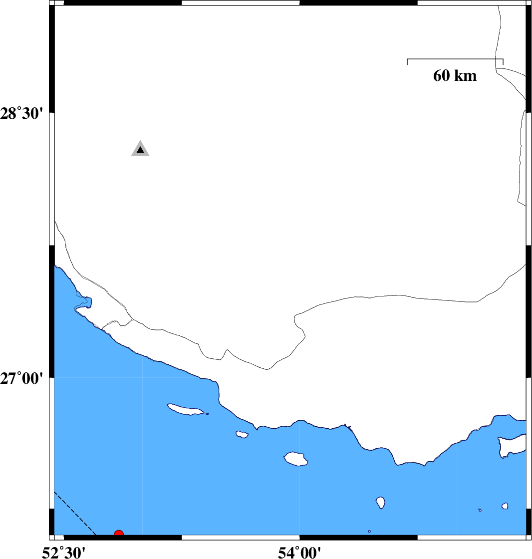 | 2011/04/26 | 01:43:25.3 | 06:13:25.3 | 26.56 | 55.36 | 27 | ML3.2 | Persian Gulf, 51 km East of Bandar-e lengeh |