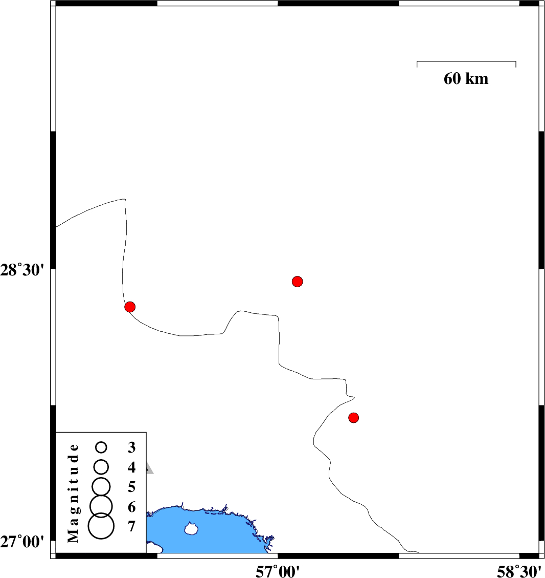 | 2011/05/02 | 19:40:07.5 | 00:10:07.5 | 28.29 | 56.08 | 14 | ML3 | Kerman Province, 17 km East of Hajiabad | ||