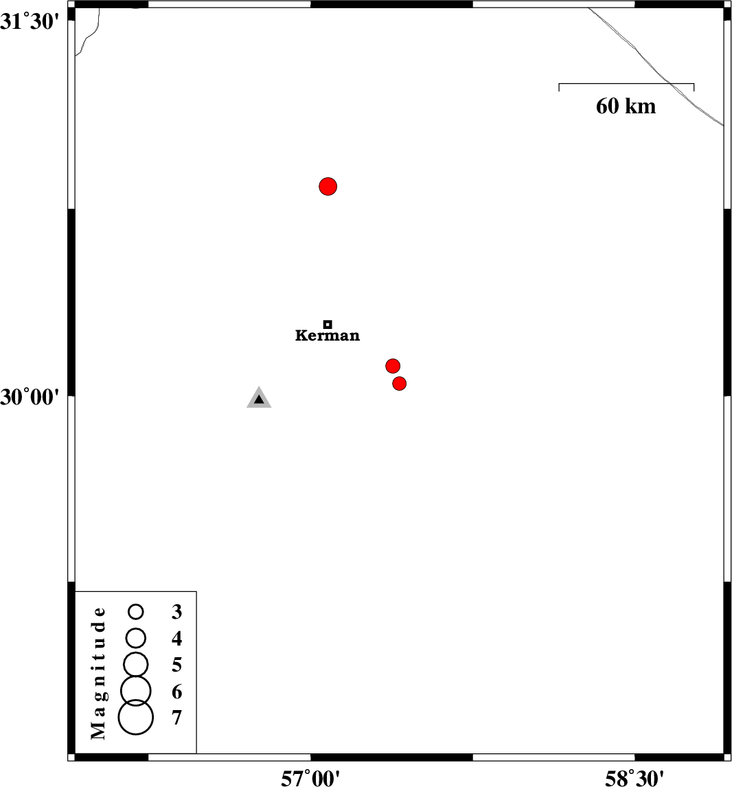 | 2011/04/30 | 08:55:13.2 | 13:25:13.2 | 30.84 | 57.08 | 14 | ML3.7 | Kerman Province, 49 km East of Zarand |
