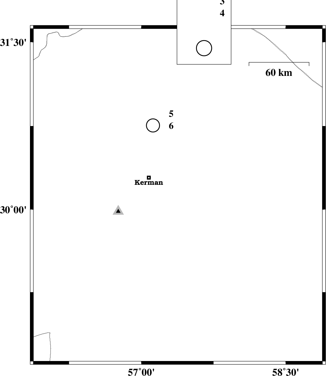 | 2011/04/30 | 08:55:13.2 | 13:25:13.2 | 30.84 | 57.08 | 14 | ML3.7 | Kerman Province, 49 km East of Zarand |