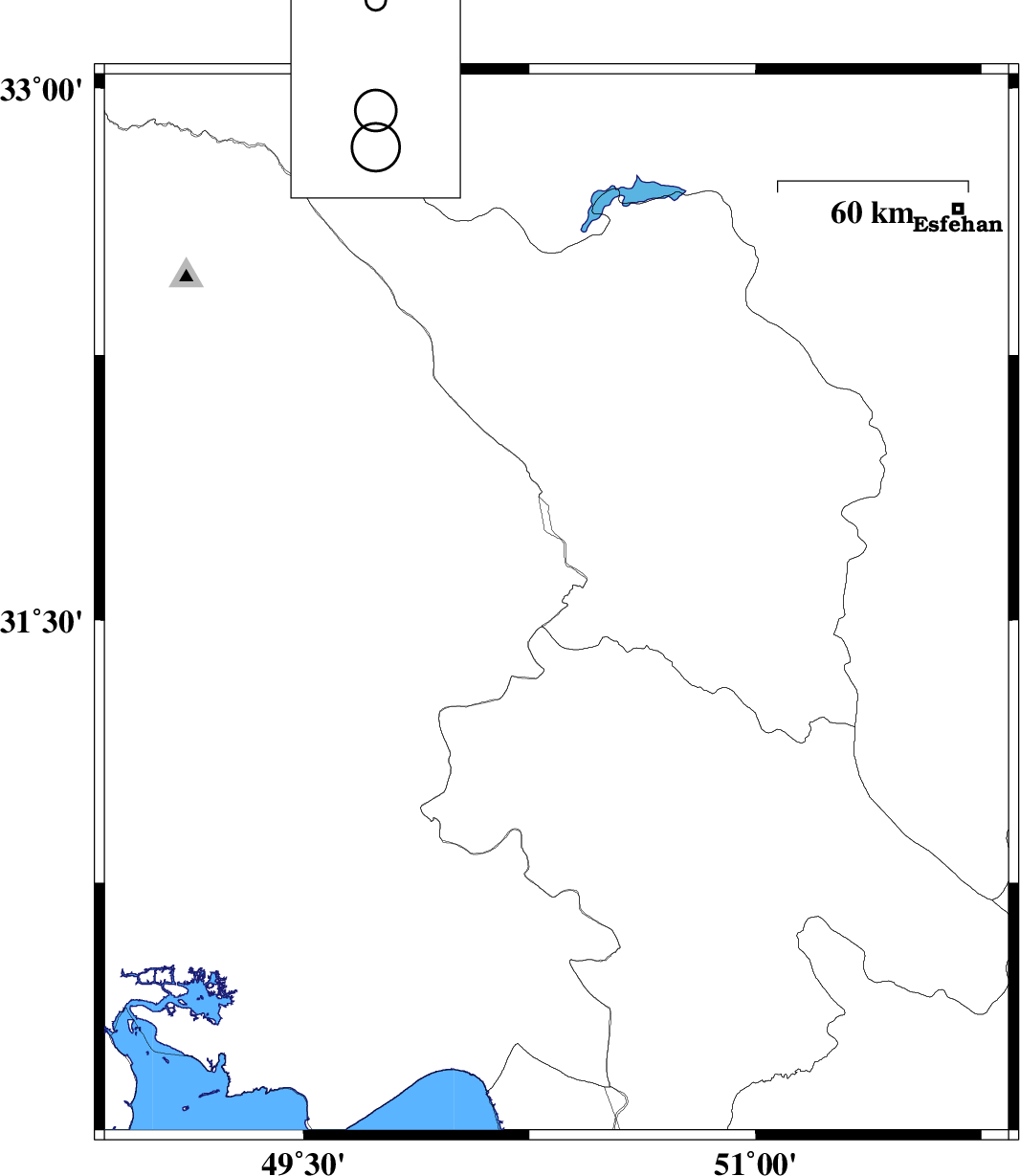 | 2011/06/08 | 09:43:42.8 | 14:13:42.8 | 31.54 | 50.34 | 15 | ML3.5 | Khoozestan Province, 42 km East of Bagh Malek | ||
