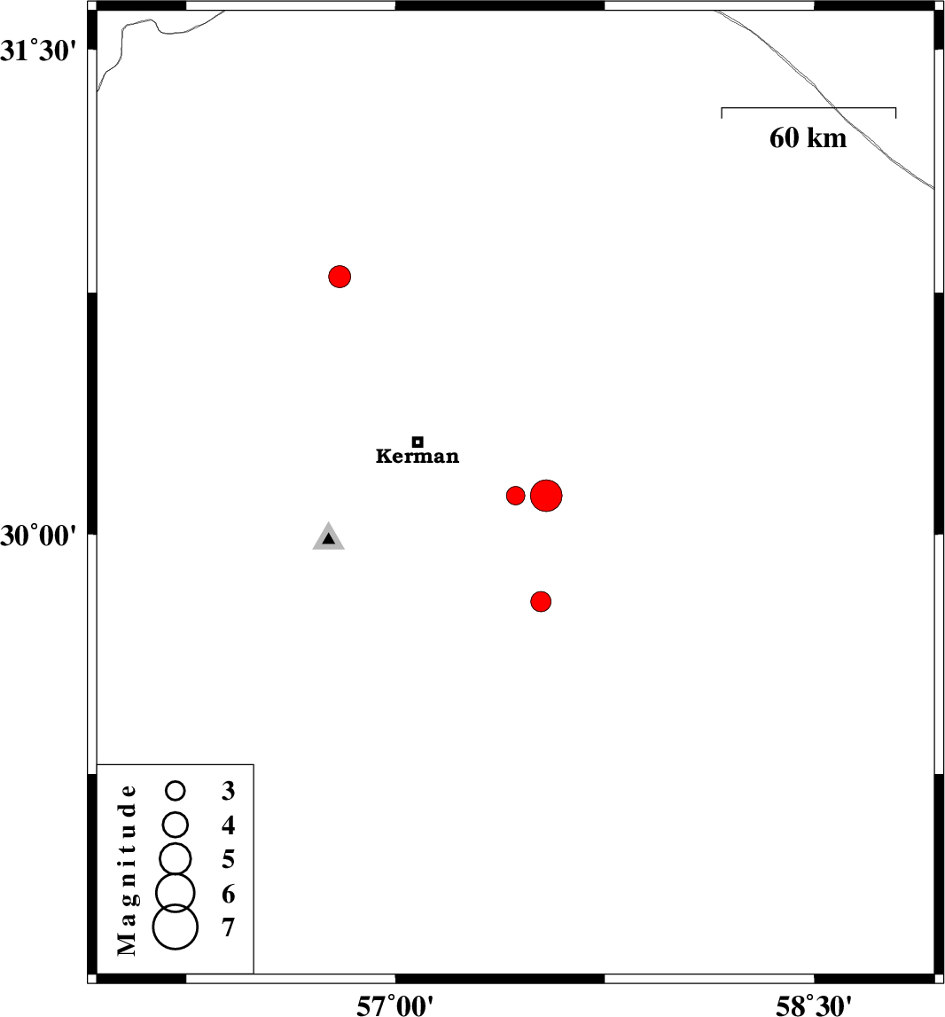 | 2011/05/31 | 01:13:24.0 | 05:43:24.0 | 30.8 | 56.8 | 9 | ML3.5 | Kerman Province, 22 km East of Zarand |
