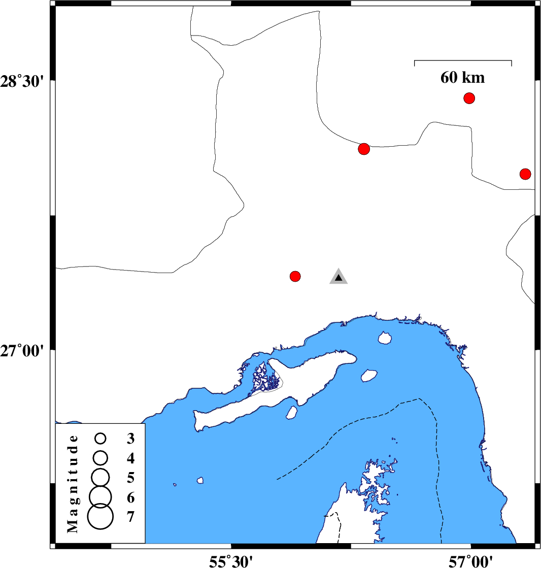| 2011/06/26 | 19:01:35.4 | 23:31:35.4 | 27.41 | 55.9 | 14 | ML2.9 | Hormozgan Province, 45 km North-West of Bandar-e abbas | ||