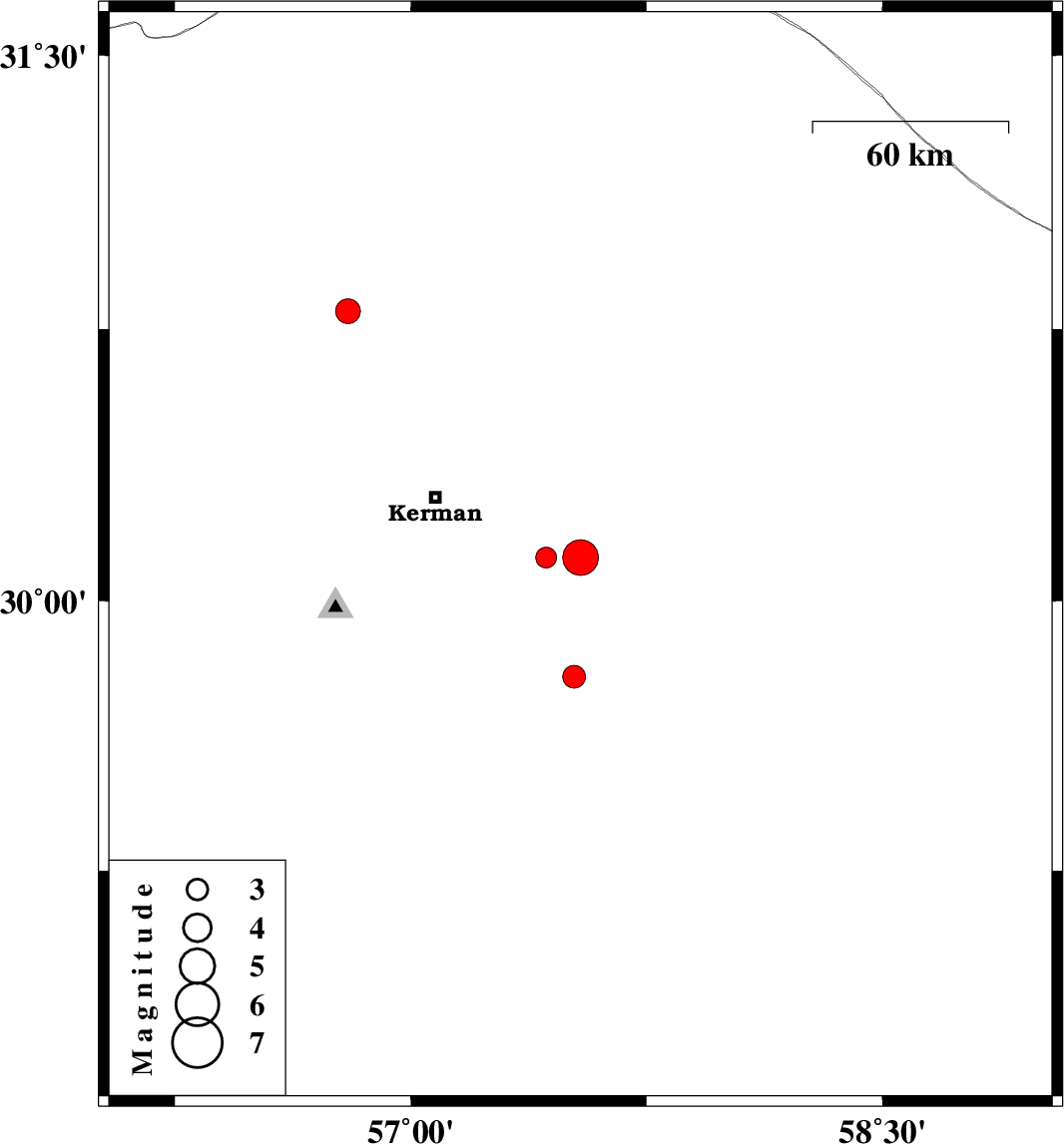 | 2011/06/26 | 09:50:28.0 | 14:20:28.0 | 29.79 | 57.52 | 9 | ML3.3 | Kerman Province, 70 km South-East of Kerman | ||