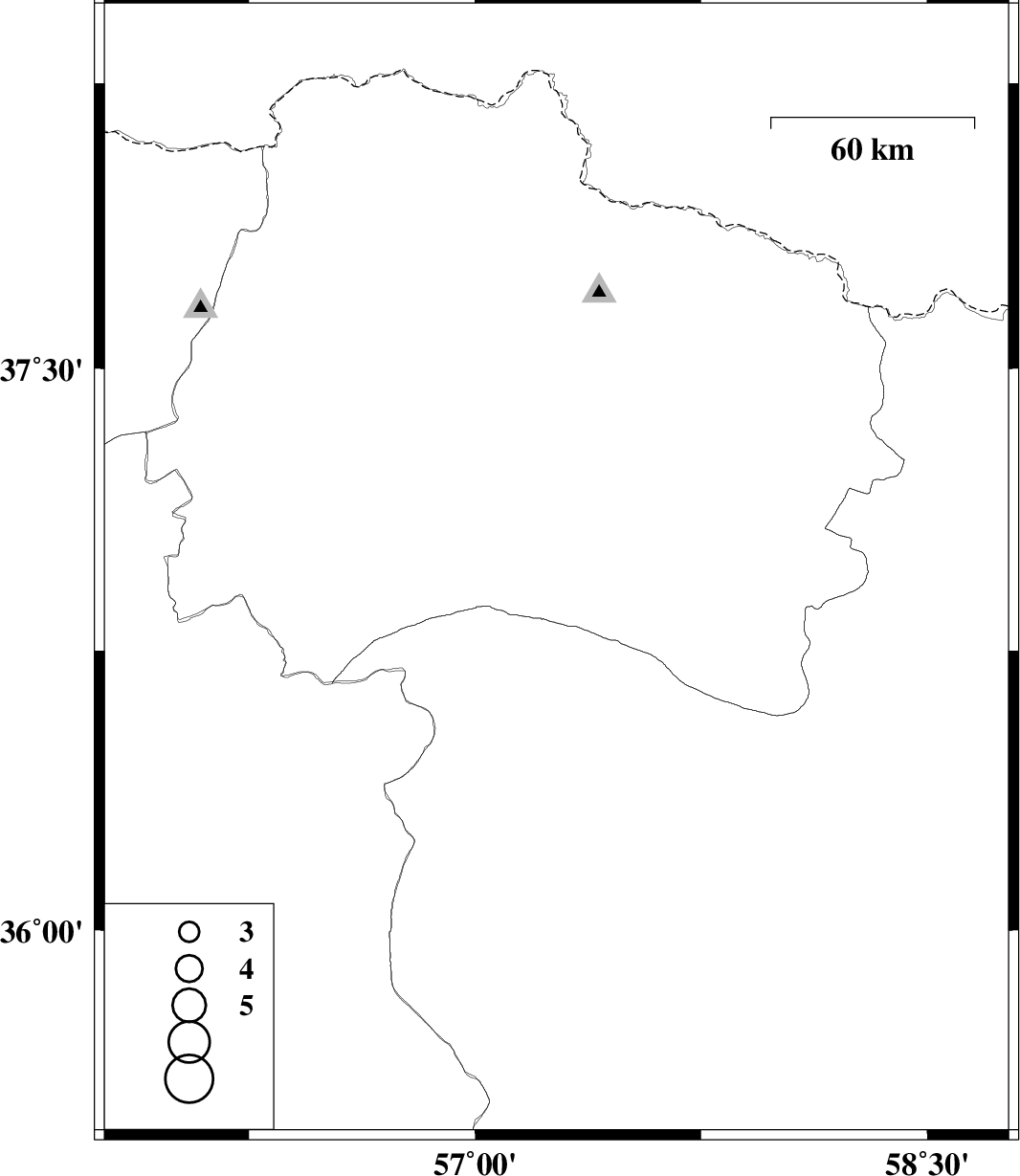 | 2011/06/28 | 02:07:51.4 | 06:37:51.4 | 36.96 | 57.27 | 14 | ML3.5 | Khorasan(north) Province, 23 km West of Esfarayen |