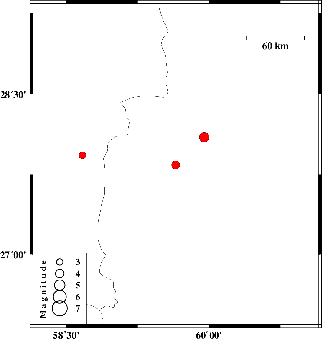 | 2011/07/04 | 07:46:27.2 | 12:16:27.2 | 27.93 | 58.67 | 14 | ML3.4 | Kerman Province, 96 km East of Kahnuj | ||