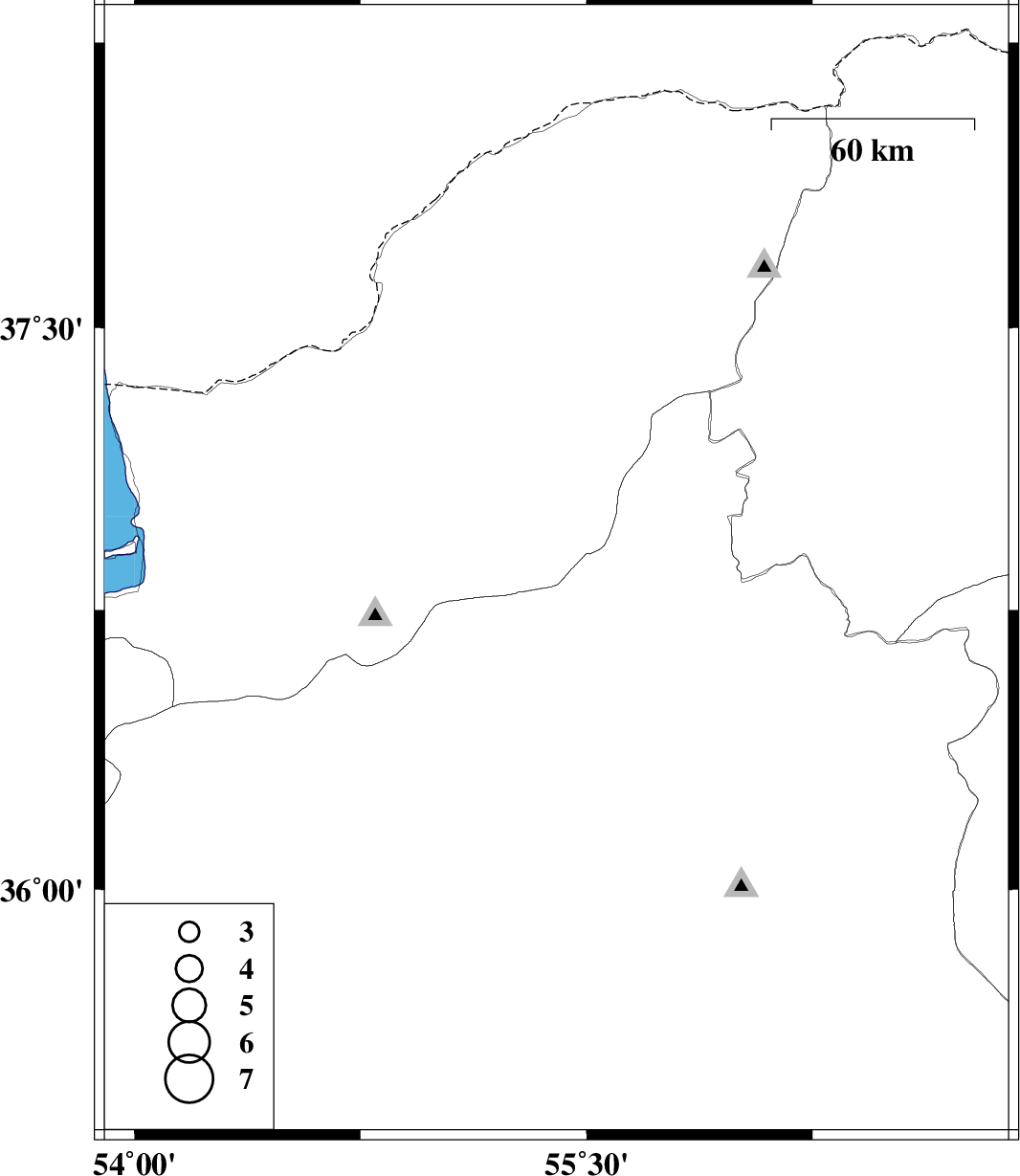 | 2011/07/23 | 04:09:40.0 | 08:39:40.0 | 36.85 | 55.4 | 6 | ML3.6 | Golestan Province, 43 km South of Minodasht |
