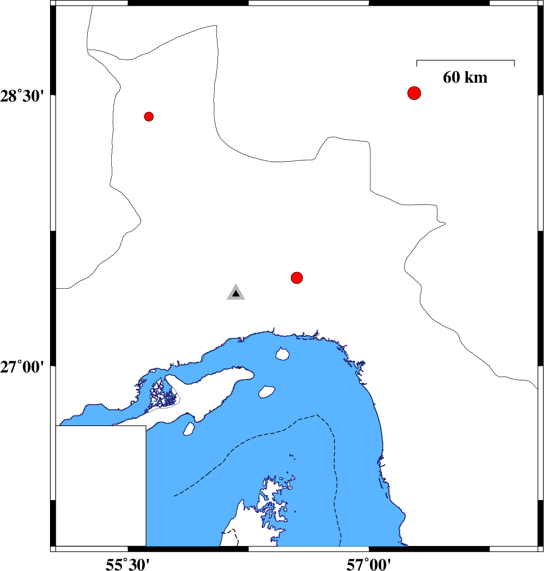 | 2011/07/21 | 17:02:10.7 | 21:32:10.7 | 28.38 | 55.63 | 16 | ML2.5 | Hormozgan Province, 27 km West of Hajiabad | ||