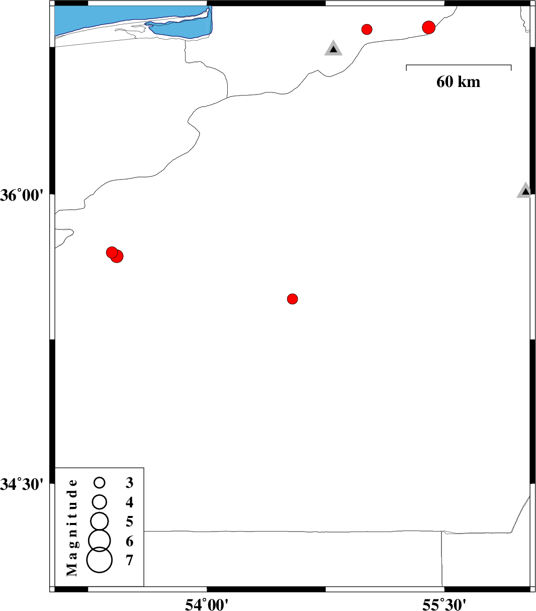 | 2011/07/23 | 04:09:40.0 | 08:39:40.0 | 36.85 | 55.4 | 6 | ML3.6 | Golestan Province, 43 km South of Minodasht | ||