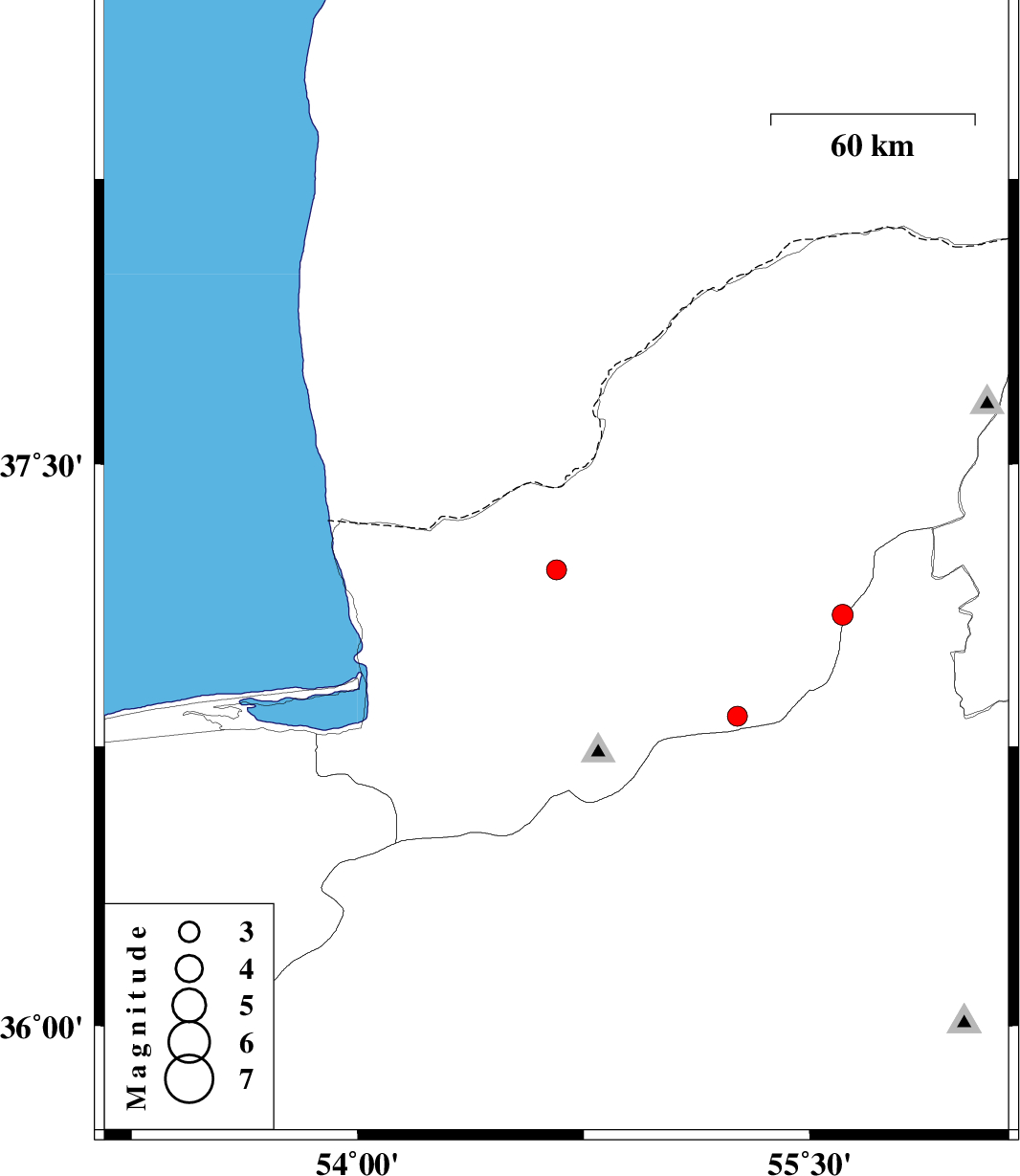 | 2011/07/30 | 06:58:27.3 | 11:28:27.3 | 36.83 | 55.26 | 14 | ML3 | Golestan Province, 23 km South-East of Ramian | ||
