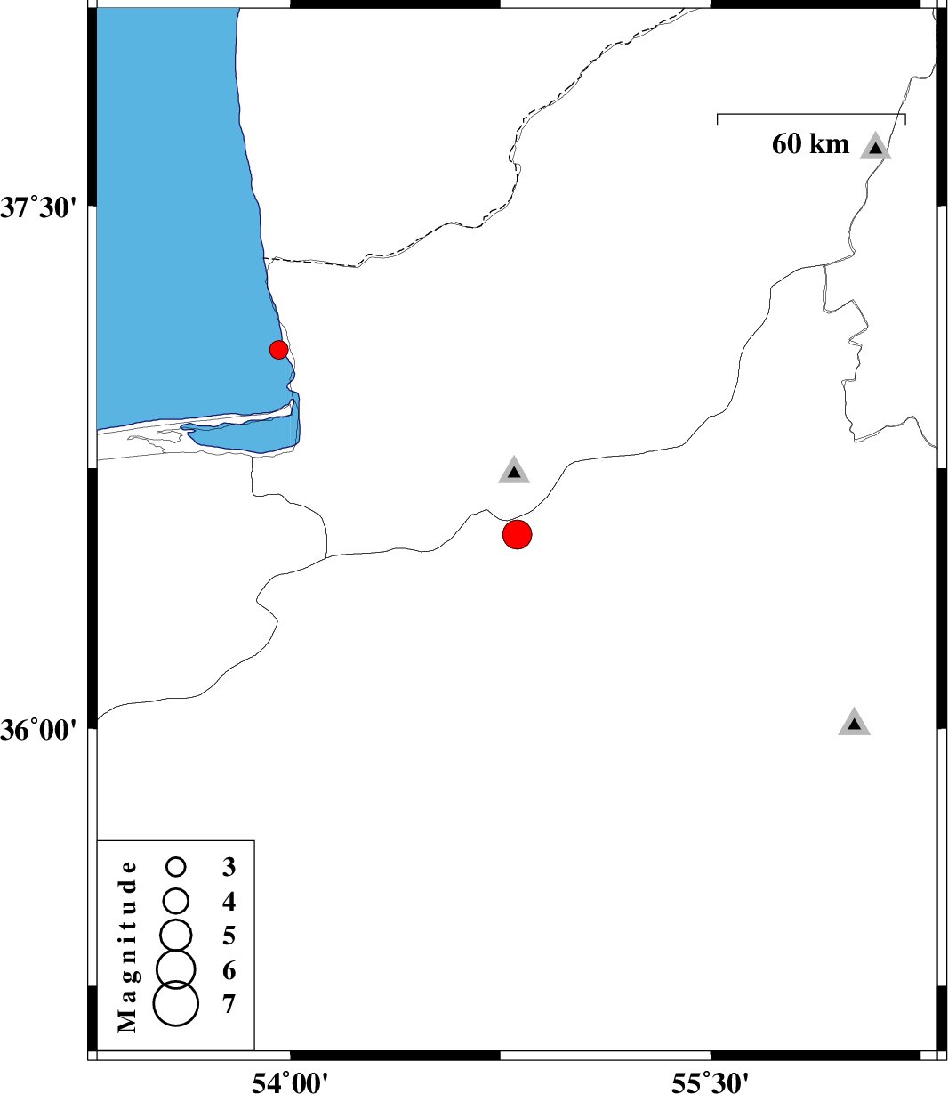 | 2011/08/06 | 19:51:18.2 | 00:21:18.2 | 37.09 | 53.96 | 37 | ML2.9 | Caspian Sea, 23 km North-West of Bandar-e torkaman |