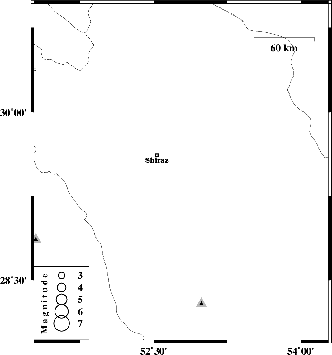 | 2011/08/15 | 02:08:30.4 | 06:38:30.4 | 29.46 | 52.78 | 18 | ML3 | Fars Province, 30 km South-East of Shiraz |