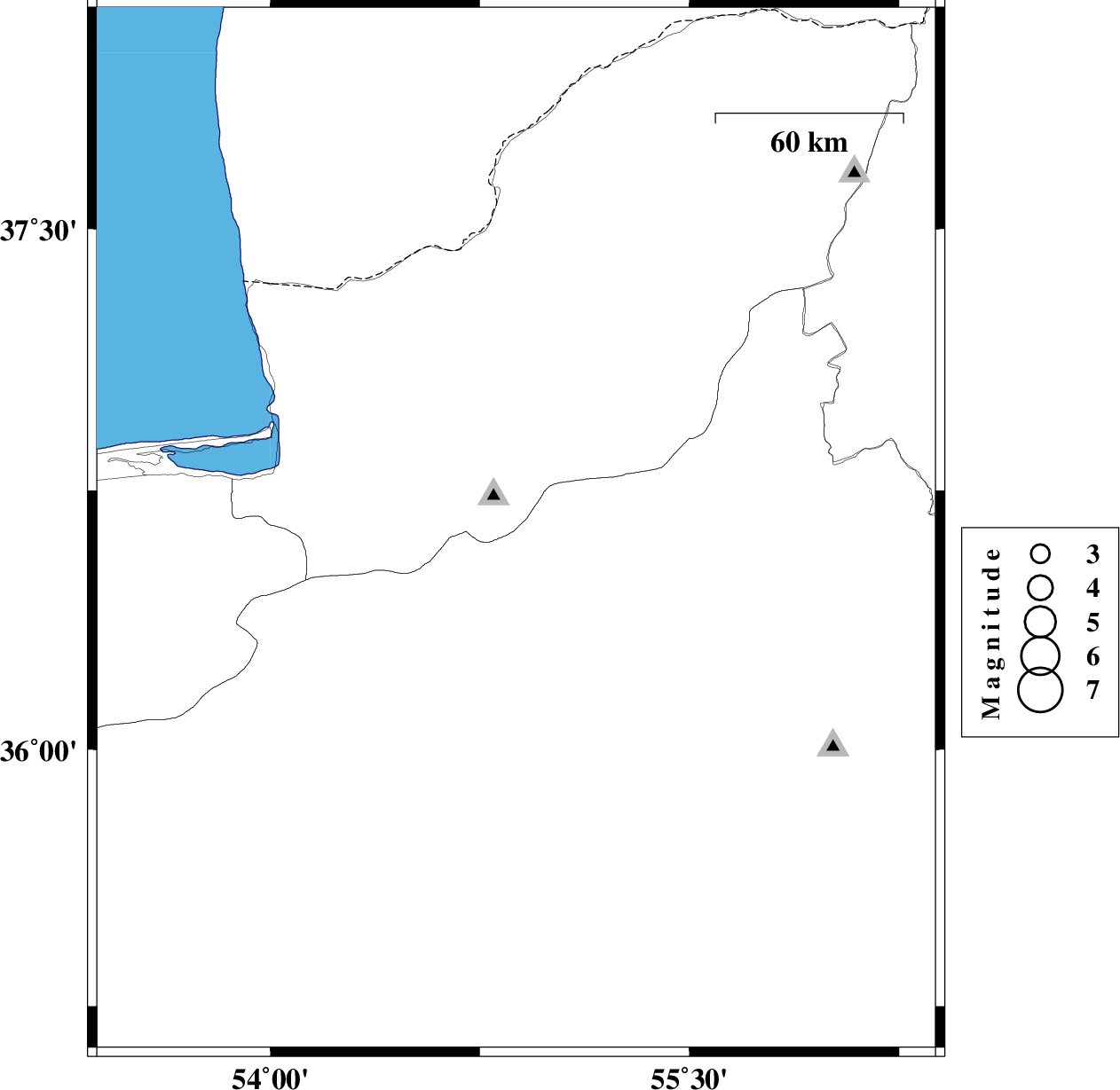 | 2011/08/17 | 06:20:35.1 | 10:50:35.1 | 36.63 | 54.88 | 14 | ML2.9 | Semnan Province, 31 km South of Ali Abad | ||