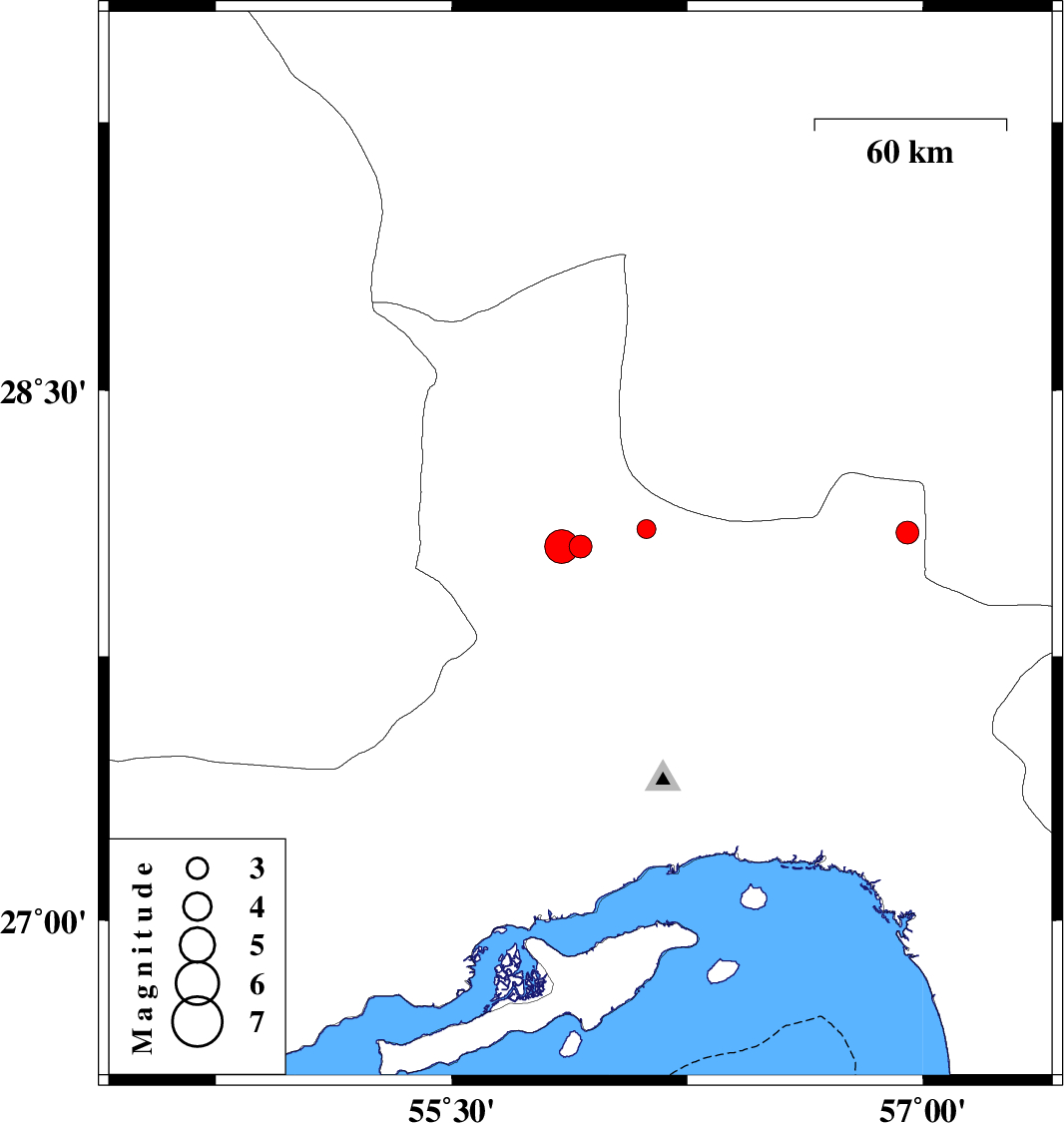 | 2011/08/20 | 04:14:07.7 | 08:44:07.7 | 28.06 | 55.91 | 14 | ML3.2 | Hormozgan Province, 27 km South of Hajiabad | ||