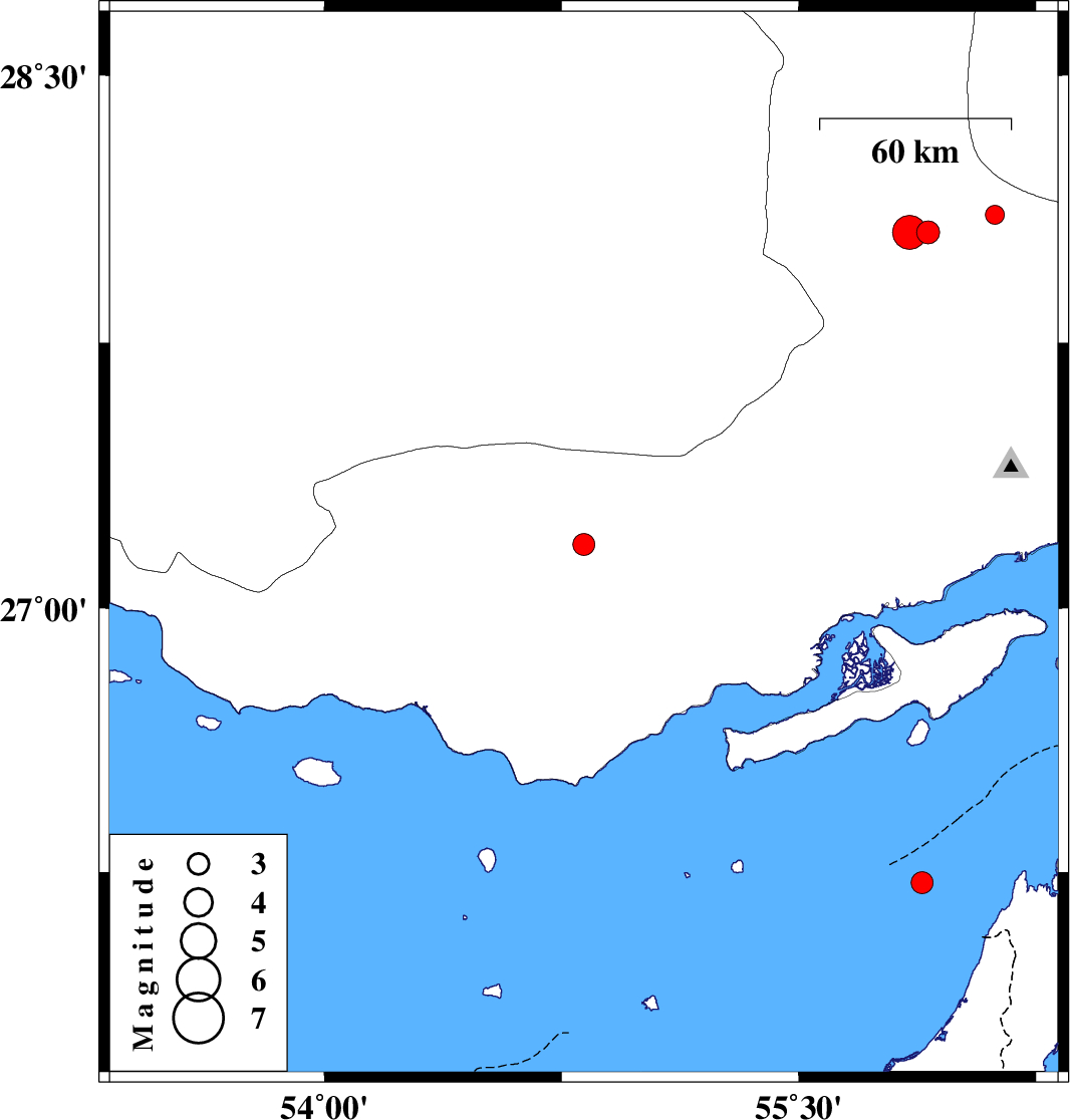 | 2011/08/20 | 04:14:07.7 | 08:44:07.7 | 28.06 | 55.91 | 14 | ML3.2 | Hormozgan Province, 27 km South of Hajiabad | ||