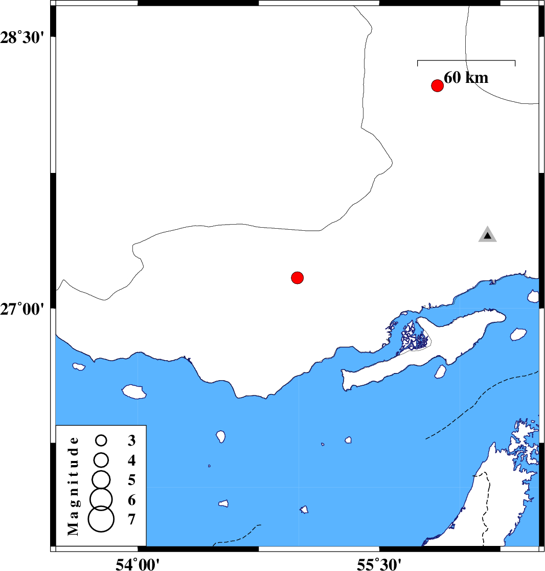 | 2011/08/27 | 15:02:06.2 | 19:32:06.2 | 28.23 | 55.86 | 6 | ML3.4 | Hormozgan Province, 10 km Hajiabad |