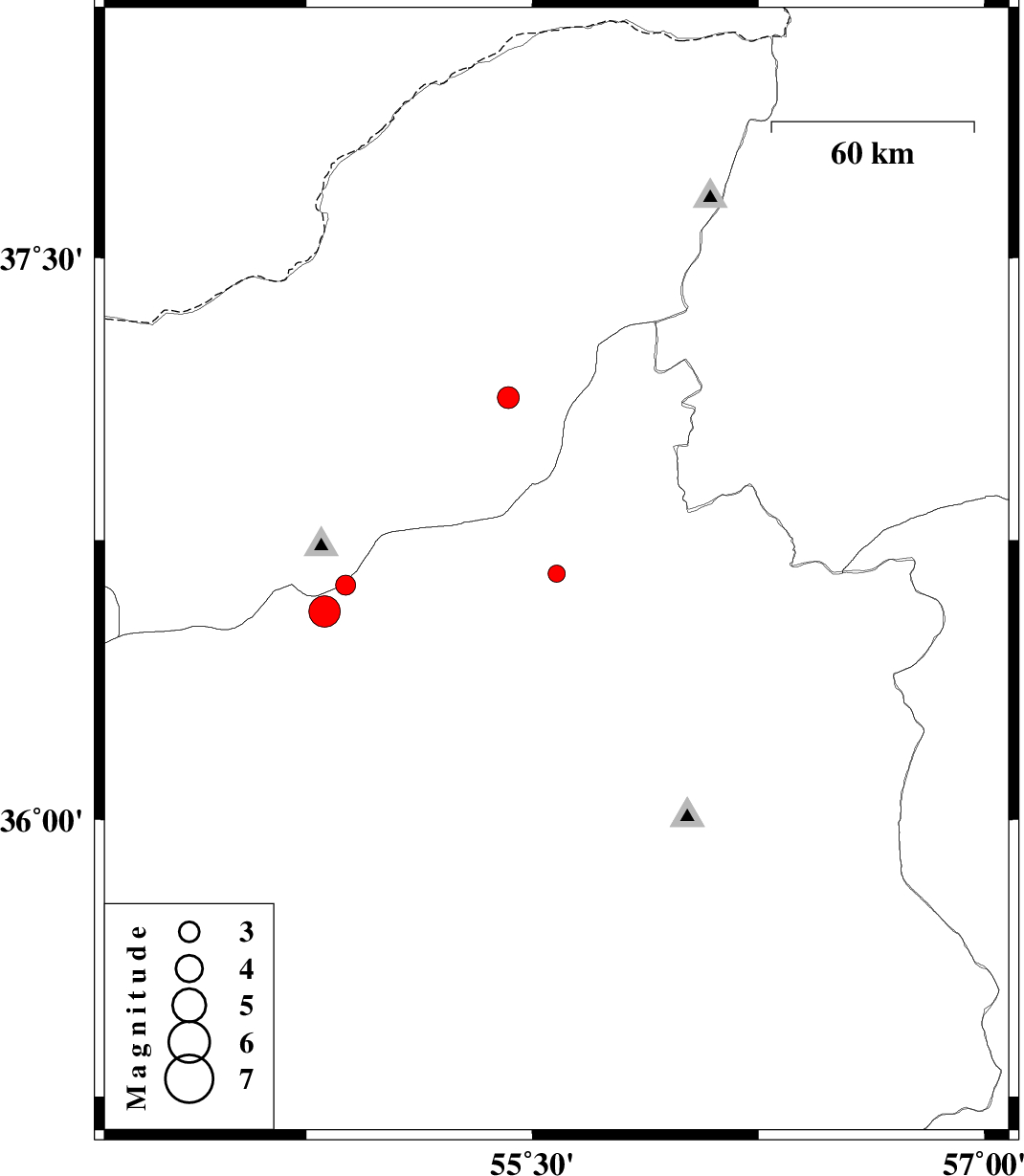 | 2011/08/30 | 16:12:42.5 | 20:42:42.5 | 37.13 | 55.42 | 15 | ML3.3 | Golestan Province, 12 km South of Minodasht | ||