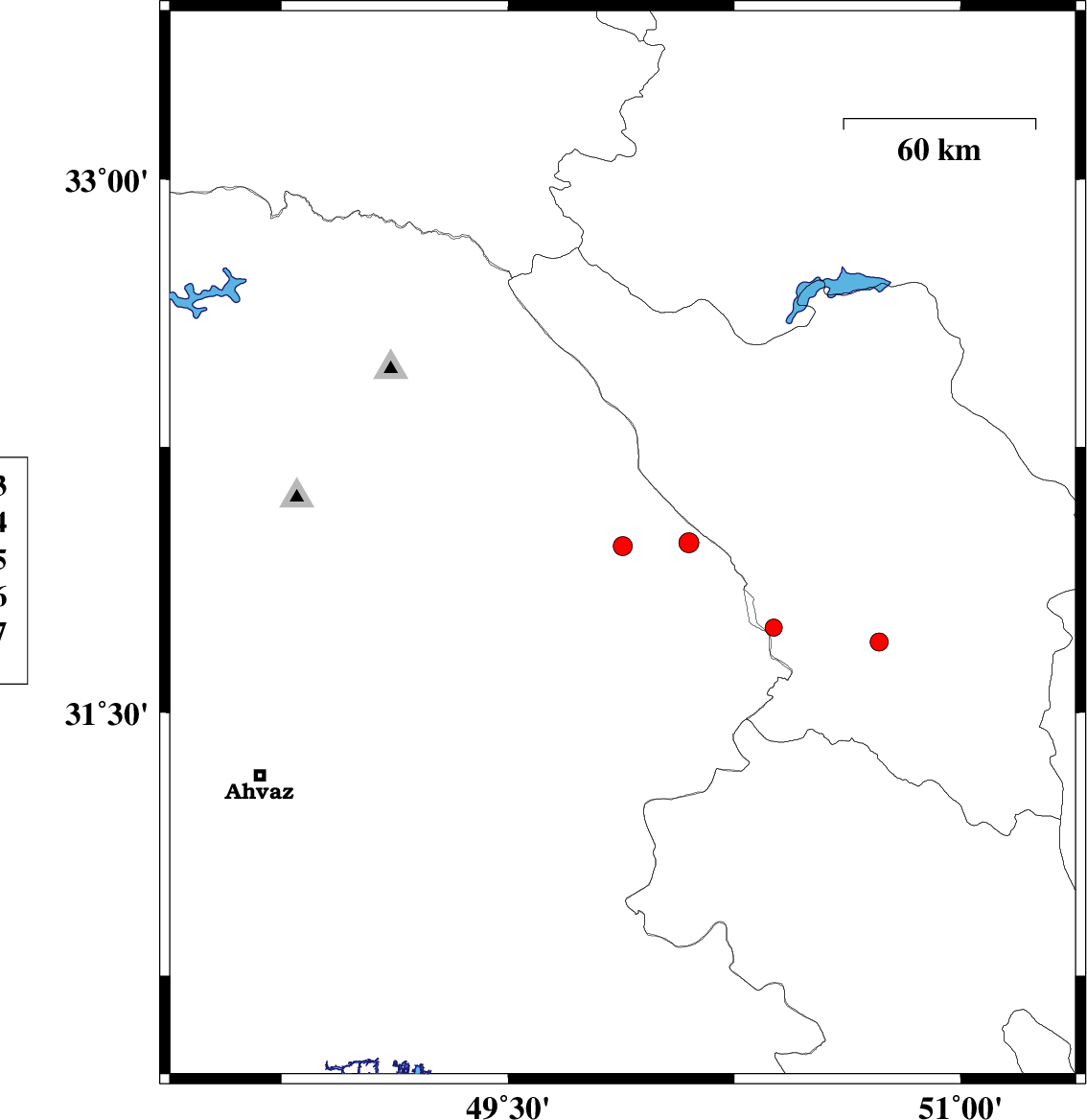 | 2011/09/07 | 09:34:46.2 | 14:04:46.2 | 31.97 | 49.88 | 32 | ML2.8 | Khoozestan Province, 15 km North of Izeh | ||