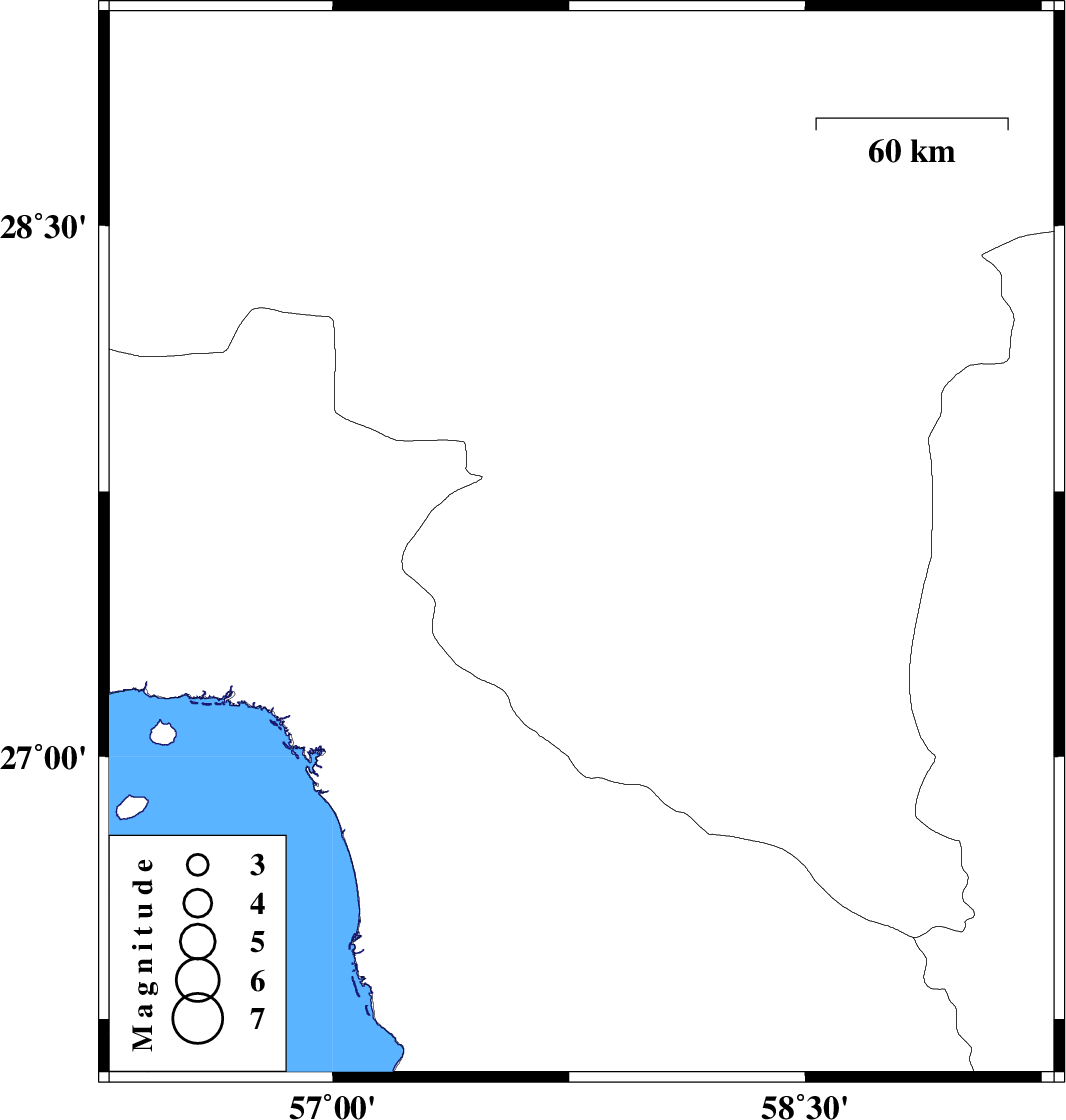 | 2011/09/13 | 05:05:08.6 | 09:35:08.6 | 27.6 | 57.79 | 40 | ML3.5 | Kerman Province, 41 km South of Kahnuj |