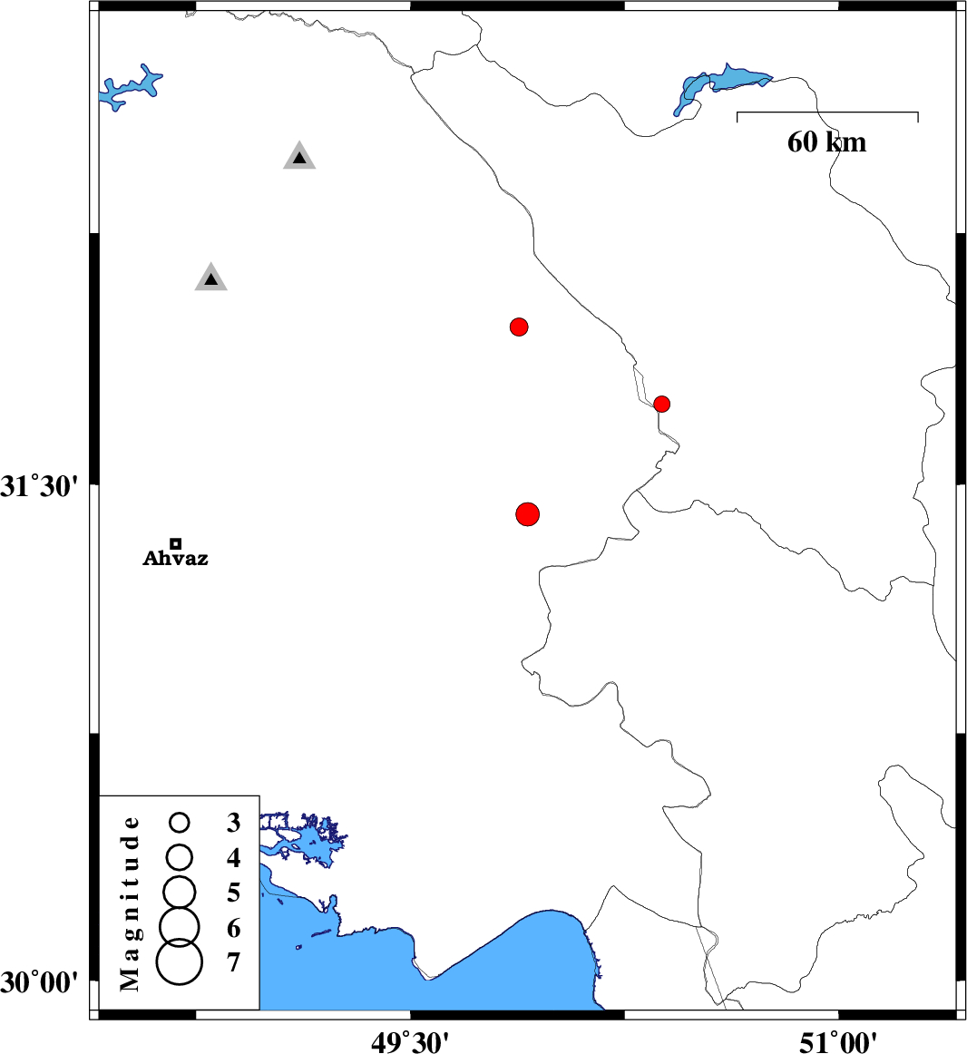 | 2011/09/14 | 15:29:55.4 | 19:59:55.4 | 31.41 | 49.91 | 18 | ML3.7 | Khoozestan Province, 12 km South of Bagh Malek | ||